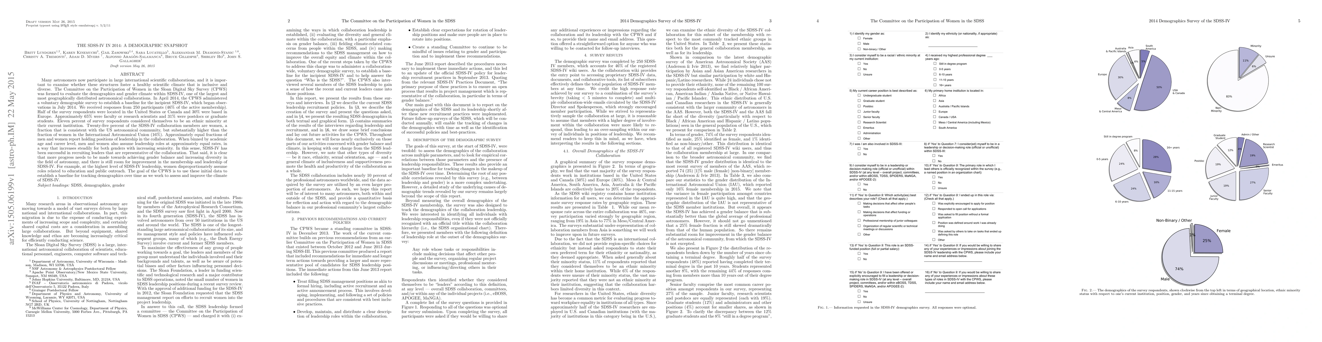 Many astronomers now participate in large international collaborations, and it is important to examine whether these structures foster a scientific climate that is inclusive and diverse. The Committee on the Participation of Women in the Sloan Digital Sky Survey (CPWS) was formed to evaluate the demographics and gender climate within SDSS-IV, one of the largest and most geographically distributed astronomical collaborations. In April 2014, the CPWS administered a demographic survey to establish a baseline for the incipient SDSS-IV. We received responses from 250 participants (46% of the active membership). Half of the survey respondents were located in the US or Canada and 30% were based in Europe. Eleven percent of survey respondents considered themselves to be an ethnic minority at their current institution. Twenty-five percent of the SDSS-IV collaboration members are women, a fraction that is consistent with the US astronomical community, but substantially higher than the fraction of women in the IAU (16%). Approximately equal fractions of men and women report holding positions of leadership. When binned by academic age and career level, men and women also assume leadership roles at approximately equal rates, in a way that increases steadily for both genders with increasing seniority. In this sense, SDSS-IV has been successful in recruiting leaders that are representative of the collaboration. Yet, more progress needs to be made towards achieving gender balance and increasing diversity in the field of astronomy, and there is still room for improvement in the membership and leadership of SDSS-IV. For example, at the highest level of SDSS-IV leadership, women disproportionately assume roles related to education and public outreach. The CPWS plans to use these initial data to establish a baseline for tracking demographics over time as we work to assess and improve the climate of SDSS-IV.