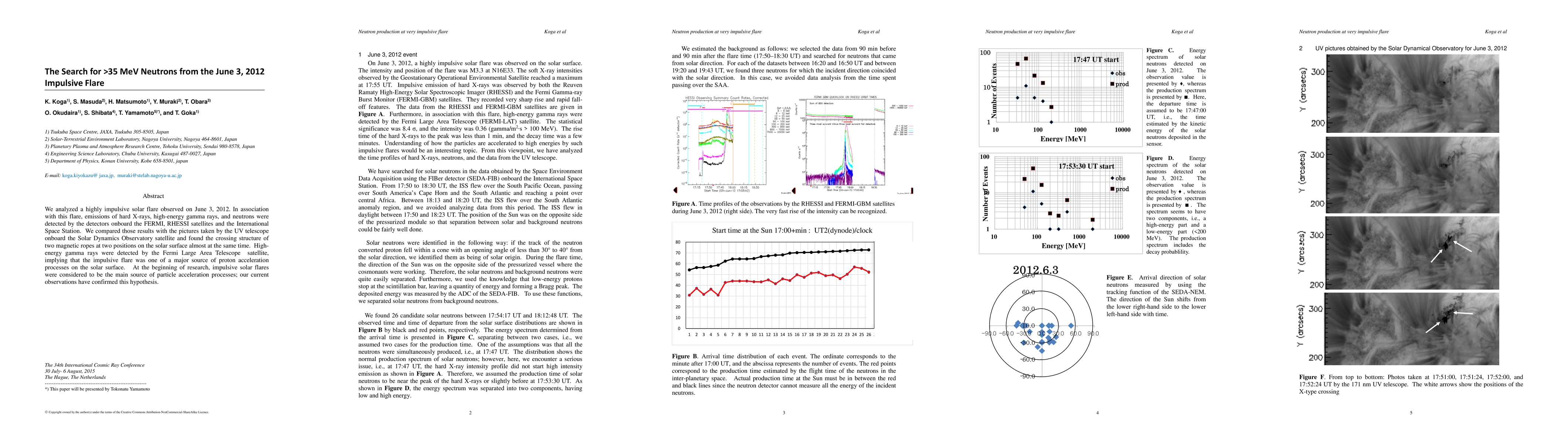 We analyzed a highly impulsive solar flare observed on June 3, 2012. In association with this flare, emissions of hard X-rays, high-energy gamma rays, and neutrons were detected by the detectors onboard the FERMI, RHESSI satellites and the International Space Station. We compared those results with the pictures taken by the UV telescope onboard the Solar Dynamics Observatory satellite and found the crossing structure of two magnetic ropes at two positions on the solar surface almost at the same time. High-energy gamma rays were detected by the Fermi Large Area Telescope satellite, implying that the impulsive flare was one of a major source of proton acceleration processes on the solar surface. At the beginning of research, impulsive solar flares were considered to be the main source of particle acceleration processes; our current observations have confirmed this hypothesis.