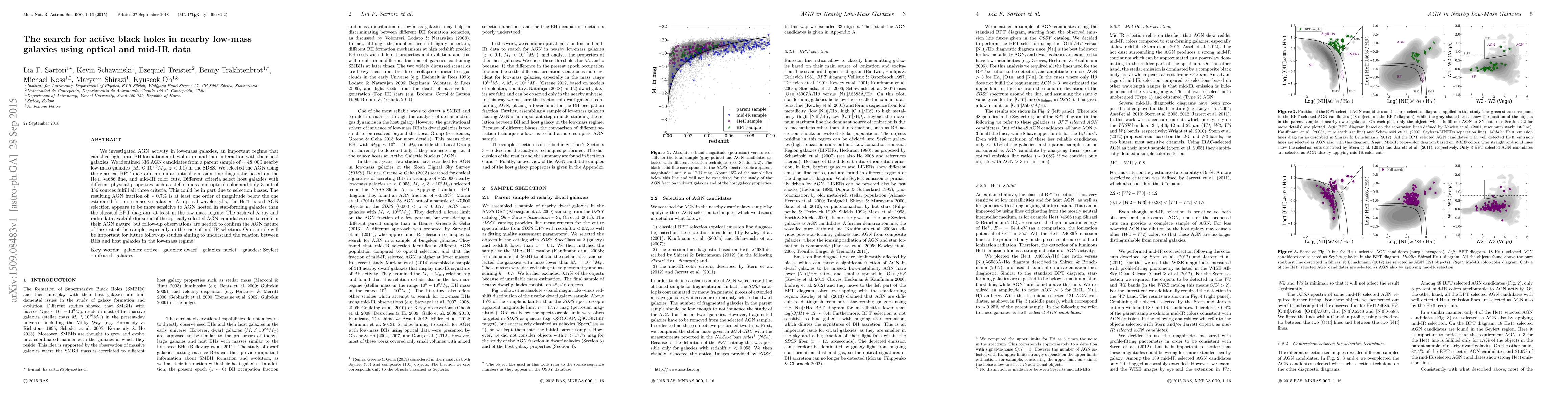 Researchers identified 336 active black hole candidates in nearby low-mass galaxies using optical and mid-IR data, finding the AGN fraction to be about 0.7%.