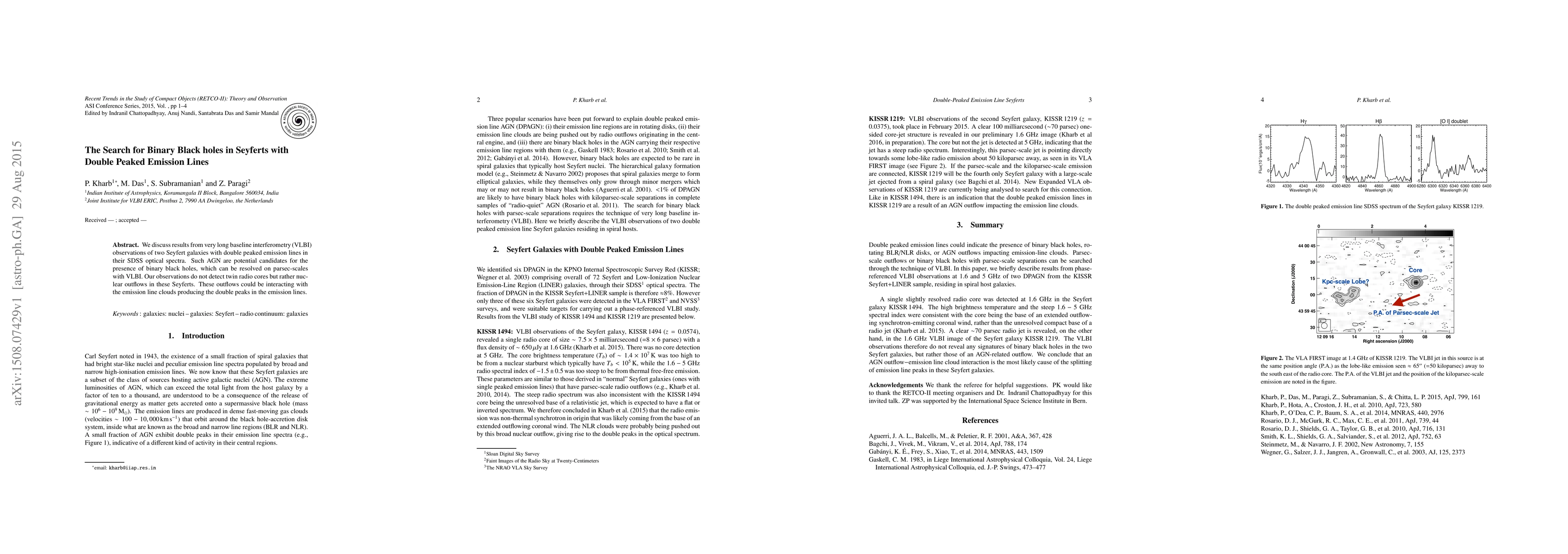 We discuss results from very long baseline interferometry (VLBI) observations of two Seyfert galaxies with double peaked emission lines in their SDSS optical spectra. Such AGN are potential candidates for the presence of binary black holes, which can be resolved on parsec-scales with VLBI. Our observations do not detect twin radio cores but rather nuclear outflows in these Seyferts. These outflows could be interacting with the emission line clouds producing the double peaks in the emission lines.