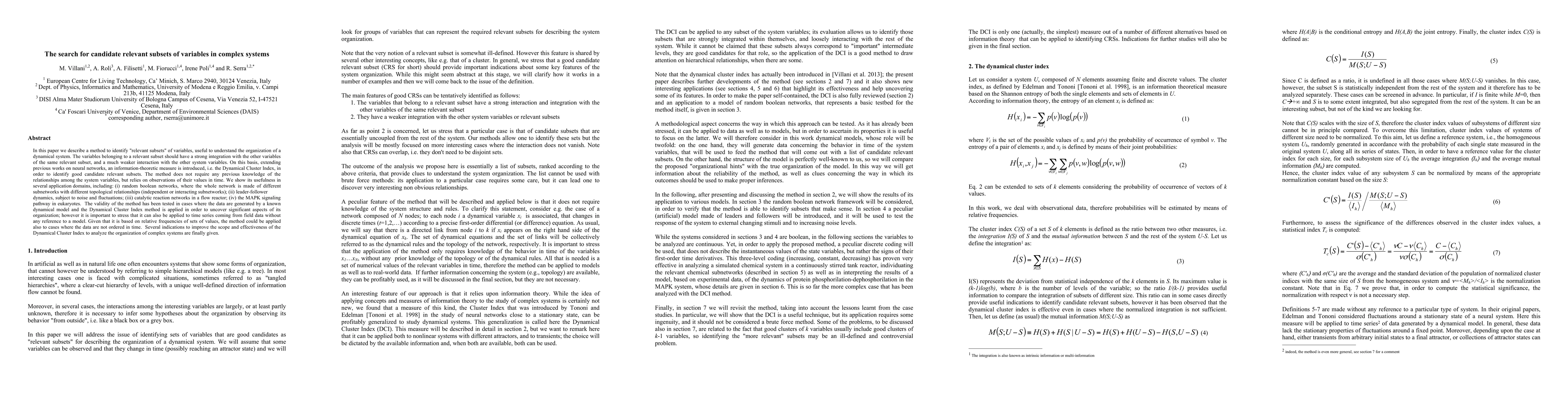 In this paper we describe a method to identify "relevant subsets" of variables, useful to understand the organization of a dynamical system. The variables belonging to a relevant subset should have a strong integration with the other variables of the same relevant subset, and a much weaker interaction with the other system variables. On this basis, extending previous works on neural networks, an information-theoretic measure is introduced, i.e. the Dynamical Cluster Index, in order to identify good candidate relevant subsets. The method does not require any previous knowledge of the relationships among the system variables, but relies on observations of their values in time. We show its usefulness in several application domains, including: (i) random boolean networks, where the whole network is made of different subnetworks with different topological relationships (independent or interacting subnetworks); (ii) leader-follower dynamics, subject to noise and fluctuations; (iii) catalytic reaction networks in a flow reactor; (iv) the MAPK signaling pathway in eukaryotes. The validity of the method has been tested in cases where the data are generated by a known dynamical model and the Dynamical Cluster Index method is applied in order to uncover significant aspects of its organization; however it is important to stress that it can also be applied to time series coming from field data without any reference to a model. Given that it is based on relative frequencies of sets of values, the method could be applied also to cases where the data are not ordered in time. Several indications to improve the scope and effectiveness of the Dynamical Cluster Index to analyze the organization of complex systems are finally given.