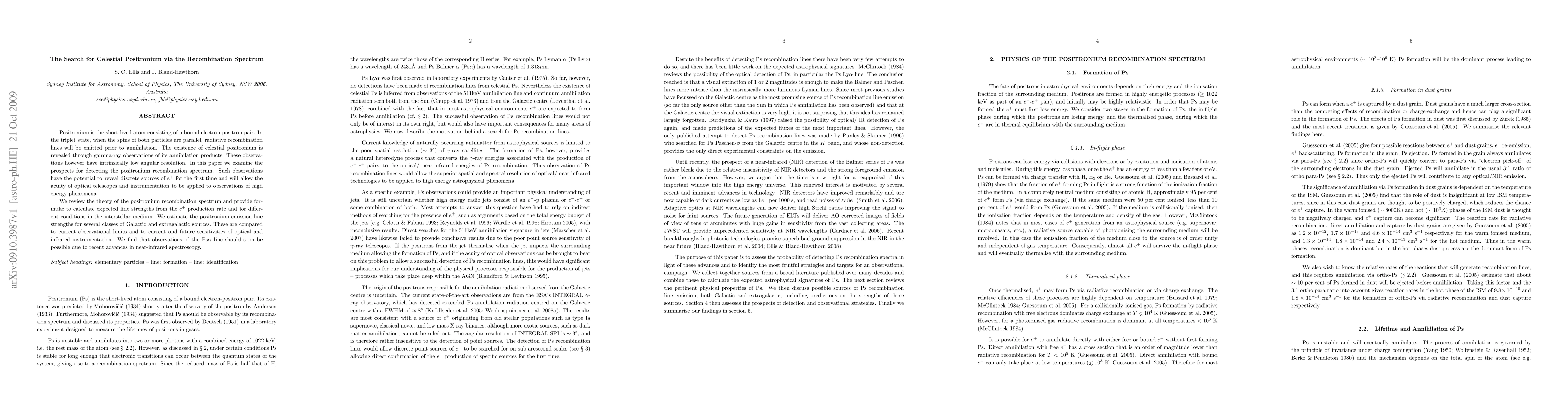 Positronium is the short-lived atom consisting of a bound electron-positron pair. In the triplet state, when the spins of both particles are parallel, radiative recombination lines will be emitted prior to annihilation. The existence of celestial positronium is revealed through gamma-ray observations of its annihilation products. These observations however have intrinsically low angular resolution. In this paper we examine the prospects for detecting the positronium recombination spectrum. Such observations have the potential to reveal discrete sources of positrons for the first time and will allow the acuity of optical telescopes and instrumentation to be applied to observations of high energy phenomena. We review the theory of the positronium recombination spectrum and provide formulae to calculate expected line strengths from the positrons production rate and for different conditions in the interstellar medium. We estimate the positronium emission line strengths for several classes of Galactic and extragalactic sources. These are compared to current observational limits and to current and future sensitivities of optical and infrared instrumentation. We find that observations of the Ps-alpha line should soon be possible due to recent advances in near-infrared spectroscopy.