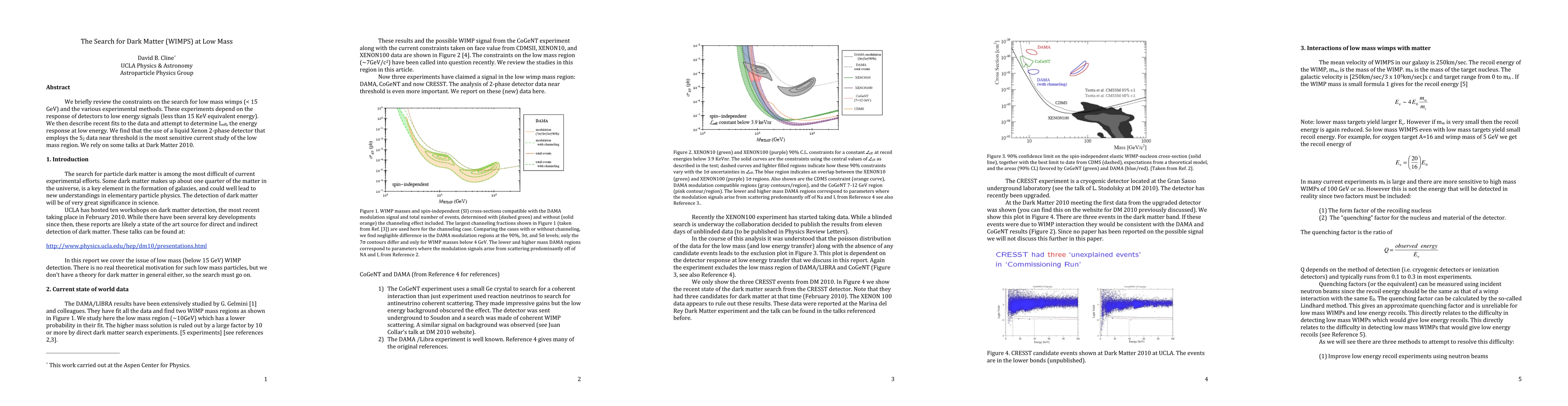 We briefly review the constraints on the search for low mass wimps (< 15 GeV) and the various experimental methods. These experiments depend on the response of detectors to low energy signals (less than 15 KeV equivalent energy). We then describe recent fits to the data and attempt to determine Leff, the energy response at low energy. We find that the use of a liquid Xenon 2-phase detector that employs the S_2 data near threshold is the most sensitive current study of the low mass region. We rely on some talks at Dark Matter 2010.