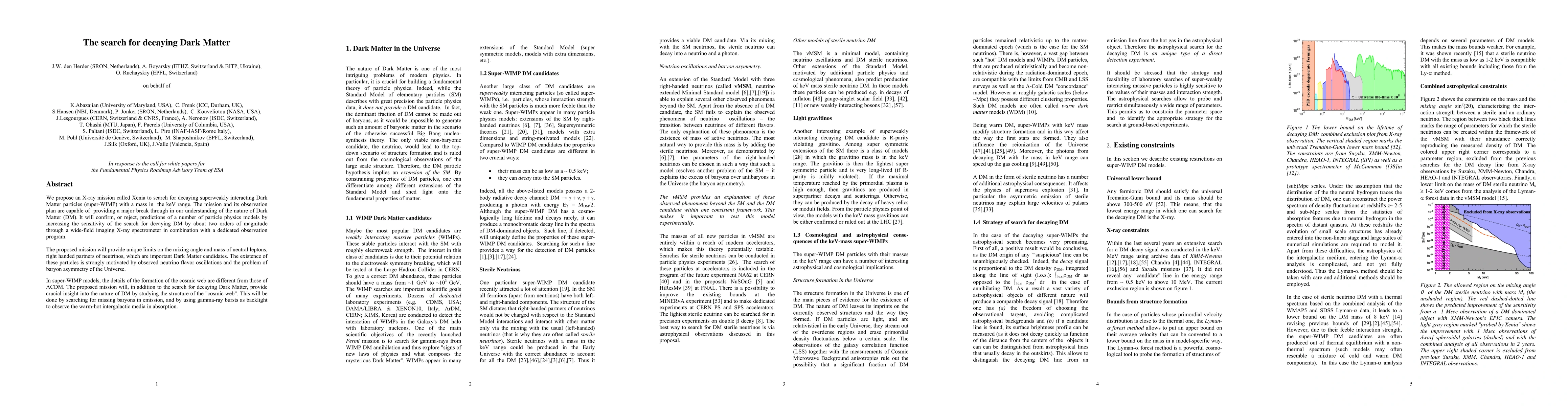 We propose an X-ray mission called Xenia to search for decaying superweakly interacting Dark Matter particles (super-WIMP) with a mass in the keV range. The mission and its observation plan are capable of providing a major break through in our understanding of the nature of Dark Matter (DM). It will confirm, or reject, predictions of a number of particle physics models by increasing the sensitivity of the search for decaying DM by about two orders of magnitude through a wide-field imaging X-ray spectrometer in combination with a dedicated observation program. The proposed mission will provide unique limits on the mixing angle and mass of neutral leptons, right handed partners of neutrinos, which are important Dark Matter candidates. The existence of these particles is strongly motivated by observed neutrino flavor oscillations and the problem of baryon asymmetry of the Universe. In super-WIMP models, the details of the formation of the cosmic web are different from those of LambdaCDM. The proposed mission will, in addition to the search for decaying Dark Matter, provide crucial insight into the nature of DM by studying the structure of the "cosmic web". This will be done by searching for missing baryons in emission, and by using gamma-ray bursts as backlight to observe the warm-hot intergalactic media in absorption.