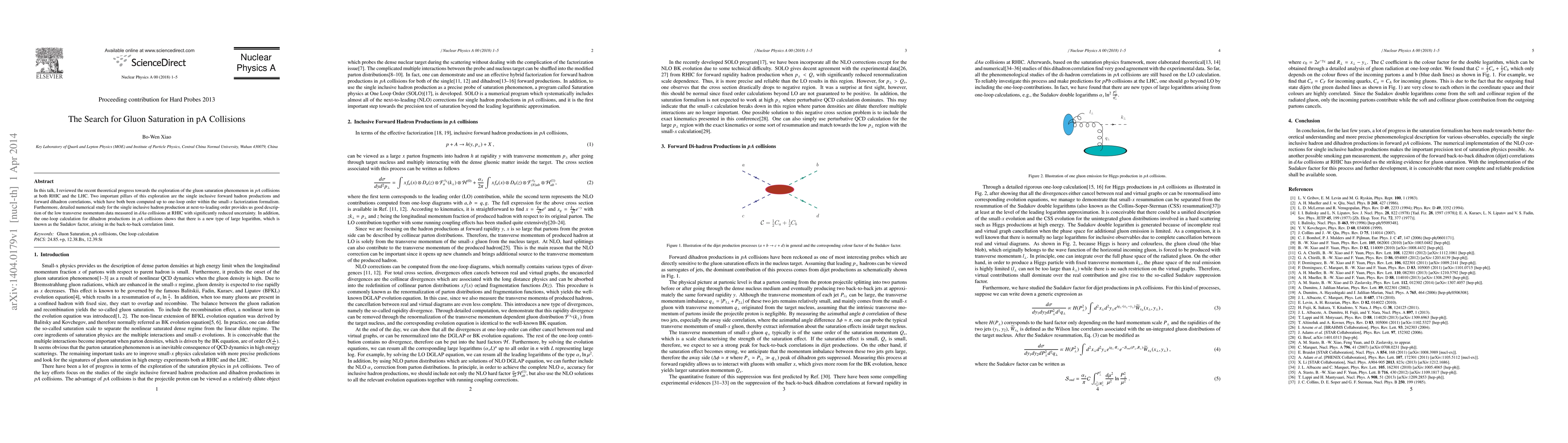 In this talk, I reviewed the recent theoretical progress towards the exploration of the gluon saturation phenomenon in $pA$ collisions at both RHIC and the LHC. Two important pillars of this exploration are the single inclusive forward hadron productions and forward dihadron correlations, which have both been computed up to one-loop order within the small-$x$ factorization formalism. Furthermore, detailed numerical study for the single inclusive hadron production at next-to-leading order provides us good description of the low transverse momentum data measured in $dAu$ collisions at RHIC with significantly reduced uncertainty. In addition, the one-loop calculation for dihadron productions in $pA$ collisions shows that there is a new type of large logarithm, which is known as the Sudakov factor, arising in the back-to-back correlation limit.