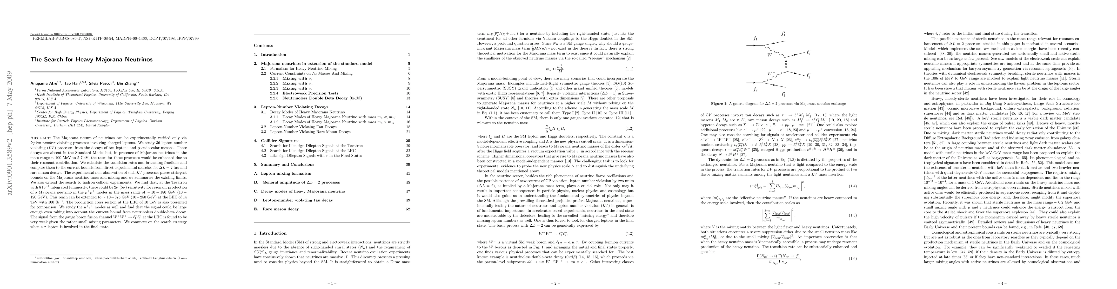 The Majorana nature of neutrinos can be experimentally verified only via {\it lepton-number} violating processes involving charged leptons. We study 36 lepton-number violating ($\lv$) processes from the decays of tau leptons and pseudoscalar mesons. These decays are absent in the Standard Model but, in presence of Majorana neutrinos in the mass range $\sim 100 \mev$ to $5 \gev$, the rates for these processes would be enhanced due to their resonant contribution. We calculate the transition rates and branching fractions and compare them to the current bounds from direct experimental searches for $\dl=2$ tau and rare meson decays. The experimental non-observation of such $\lv$ processes places stringent bounds on the Majorana neutrino mass and mixing and we summarize the existing limits. We also extend the search to hadron collider experiments. We find that, at the Tevatron with $8 {fb}^{-1}$ integrated luminosity, there could be $2\sigma$ ($5\sigma$) sensitivity for resonant production of a Majorana neutrino in the $\mu^\pm \mu^\pm$ modes in the mass range of $\sim 10 - 180 {\gev} (10 - 120 {\gev})$. This reach can be extended to $\sim 10 - 375 {\gev} (10 - 250 mbox{\gev})$ at the LHC of 14 TeV with $100 {fb}^{-1}$. The production cross section at the LHC of 10 TeV is also presented for comparison. We study the $\mu^\pm e^\pm$ modes as well and find that the signal could be large enough even taking into account the current bound from neutrinoless double-beta decay. The signal from the gauge boson fusion channel $W^+ W^+\to \ell^+_1 \ell^+_2$ at the LHC is found to be very weak given the rather small mixing parameters. We comment on the search strategy when a $\tau$ lepton is involved in the final state.