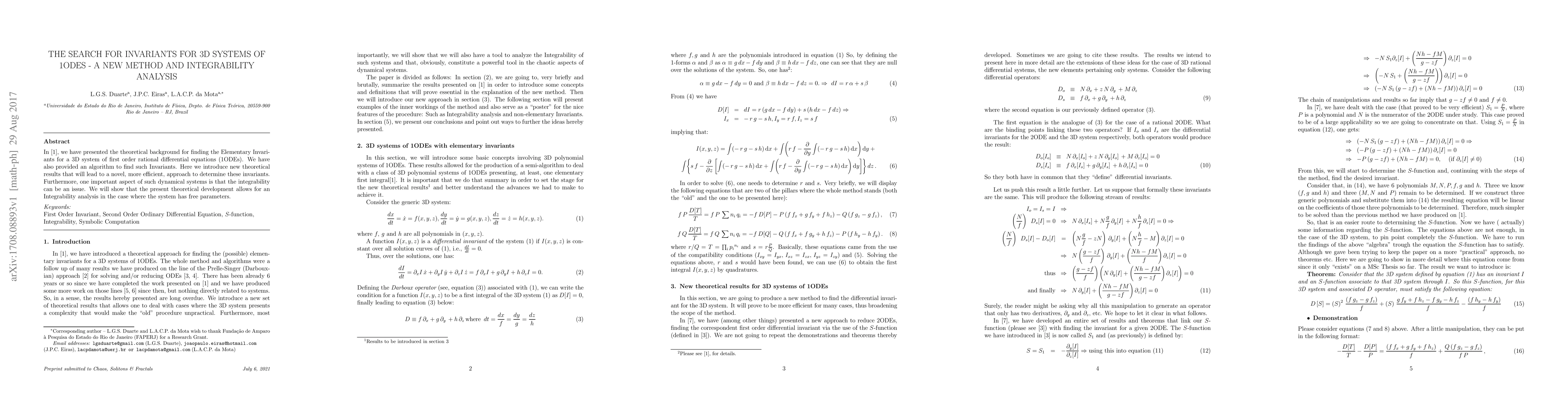 In [1], we have presented the theoretical background for finding the Elementary Invariants for a 3D system of first order rational differential equations (1ODEs). We have also provided an algorithm to find such Invariants. Here we introduce new theoretical results that will lead to a novel, more efficient, approach to determine these invariants. Furthermore, one important aspect of such dynamical systems is that the integrability can be an issue. We will show that the present theoretical development allows for an Integrability analysis in the case where the system has free parameters.