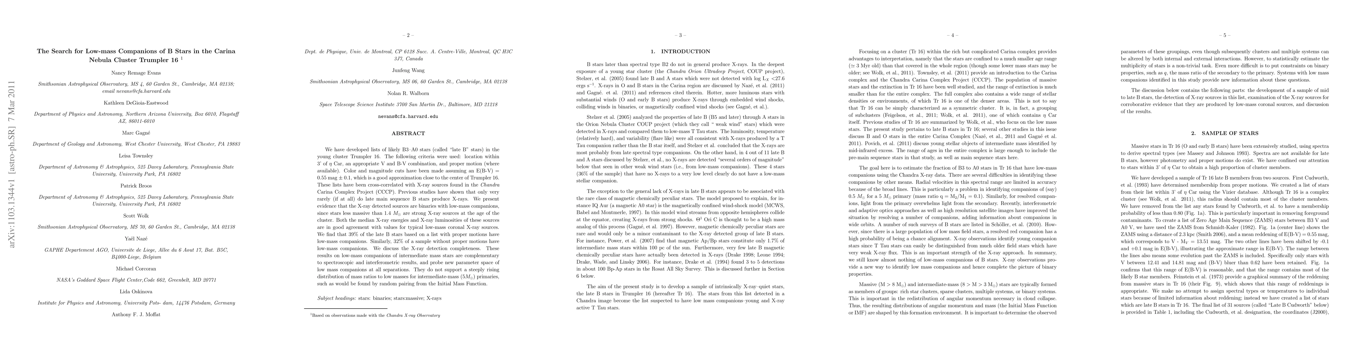 We have developed lists of likely B3--A0 stars (called "late B" stars) in the young cluster Trumpler 16. The following criteria were used: location within 3' of Eta Car, an appropriate V and B-V combination, and proper motion (where available). Color and magnitude cuts have been made assuming an E(B-V) =0.55 mag +/- 0.1, which is a good approximation close to the center of Trumpler 16. These lists have been cross-correlated with X-ray sources found in the Chandra Carina Complex Project (CCCP). Previous studies have shown that only very rarely (if at all) do late main sequence B stars produce X-rays. We present evidence that the X-ray detected sources are binaries with low-mass companions, since stars less massive than 1.4 Msun are strong X-ray sources at the age of the cluster. Both the median X-ray energies and X-ray luminosities of these sources are in good agreement with values for typical low-mass coronal X-ray sources. We find that 39% of the late B stars based on a list with proper motions have low-mass companions. Similarly, 32% of a sample without proper motions have low-mass companions. We discuss the X-ray detection completeness. These results on low-mass companions of intermediate mass stars are complementary to spectroscopic and interferometric results, and probe new parameter space of low mass companions at all separations. They do not support a steeply rising distribution of mass ratios to low masses for intermediate-mass (5 Msun) primaries, such as would be found by random pairing from the Initial Mass Function.