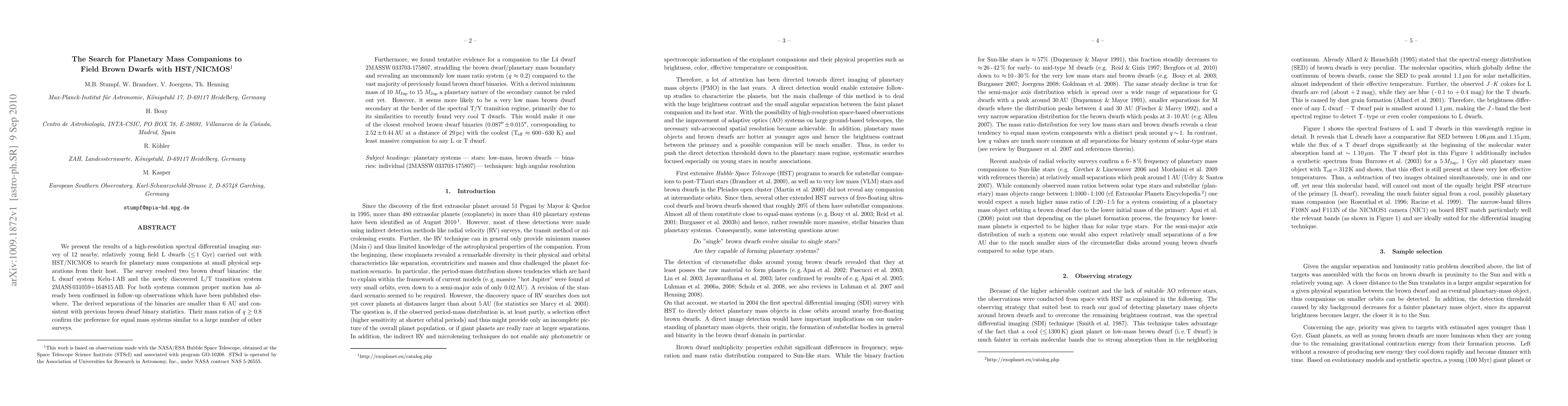 This study utilized HST/NICMOS to survey nearby young L dwarf field brown dwarfs for planetary mass companions, discovering two brown dwarf binaries and tentative evidence for a low mass companion to an L4 dwarf, suggesting it may be a very low mass brown dwarf near the T/Y transition.