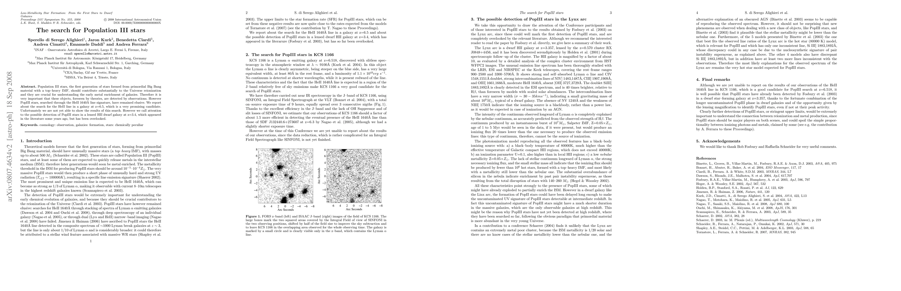 This paper discusses the ongoing search for Population III stars, the first stars formed from primordial Big Bang material, which are crucial for understanding early Universe reionization and metal enrichment. Despite promising candidates, including a galaxy at z=6.5, definitive detections remain elusive, though a possible overlooked detection in a lensed HII dwarf galaxy at z=3.4 warrants further investigation.