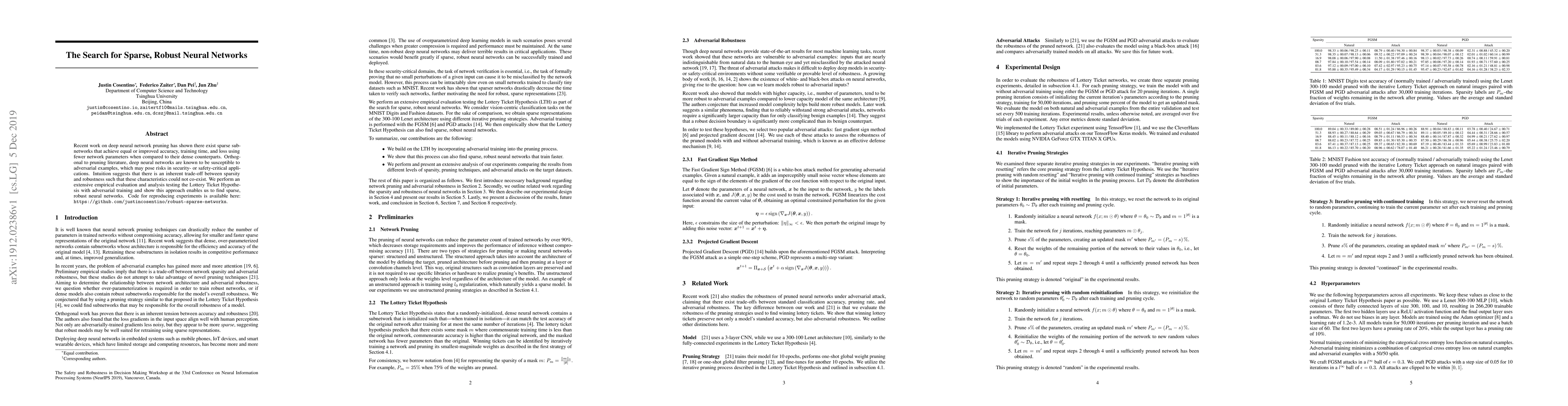 This paper explores the feasibility of creating sparse neural networks that are both robust to adversarial attacks and perform well on standard tasks. The authors demonstrate that through adversarial training and leveraging the Lottery Ticket Hypothesis, it is possible to achieve sparse networks that maintain both efficiency and robustness.
