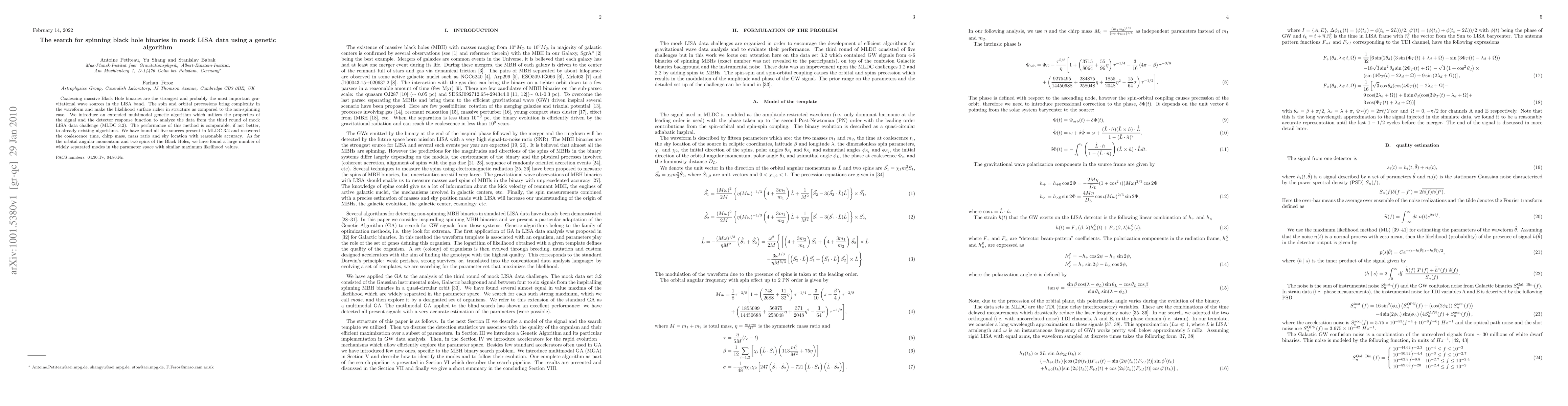 This paper introduces a genetic algorithm to detect and analyze spinning black hole binaries in mock LISA data, achieving comparable or better performance than existing methods. The algorithm successfully identified all five sources in the dataset and accurately recovered key parameters, though it found multiple modes for the spins and orbital angular momentum.