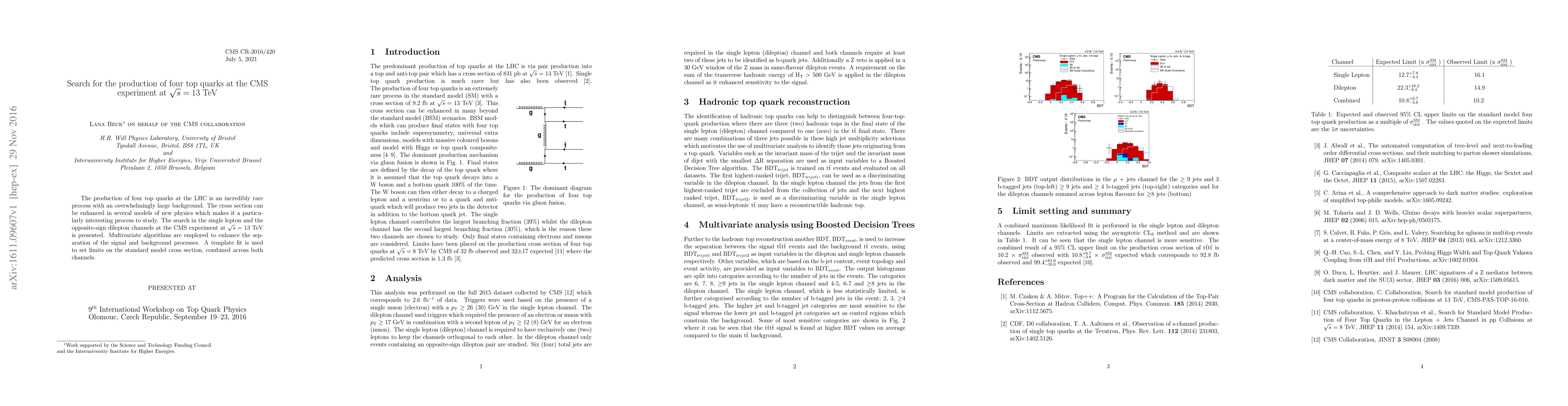 This paper presents a search for standard model four-top-quark production using the CMS experiment's 2015 dataset at 13 TeV, focusing on single lepton and opposite-sign dilepton channels. An upper limit on the four-top-quark production cross section is determined using a boosted decision tree algorithm.