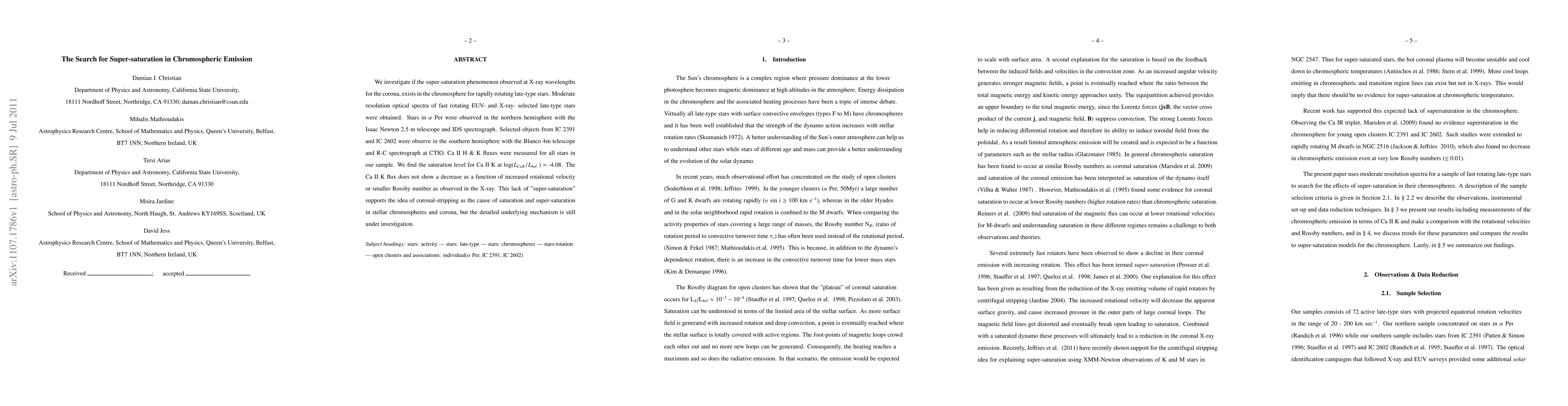 We investigate if the super-saturation phenomenon observed at X-ray wavelengths for the corona, exists in the chromosphere for rapidly rotating late-type stars. Moderate resolution optical spectra of fast rotating EUV- and X-ray- selected late-type stars were obtained. Stars in alpha Per were observed in the northern hemisphere with the Isaac Newton 2.5 m telescope and IDS spectrograph. Selected objects from IC 2391 and IC 2602 were observe in the southern hemisphere with the Blanco 4m telescope and R-C spectrograph at CTIO. Ca II H & K fluxes were measured for all stars in our sample. We find the saturation level for Ca II K at log(L_CaK/L_bol) = -4.08. The Ca II K flux does not show a decrease as a function of increased rotational velocity or smaller Rossby number as observed in the X-ray. This lack of "super-saturation" supports the idea of coronal-stripping as the cause of saturation and super-saturation in stellar chromospheres and corona, but the detailed underlying mechanism is still under investigation.