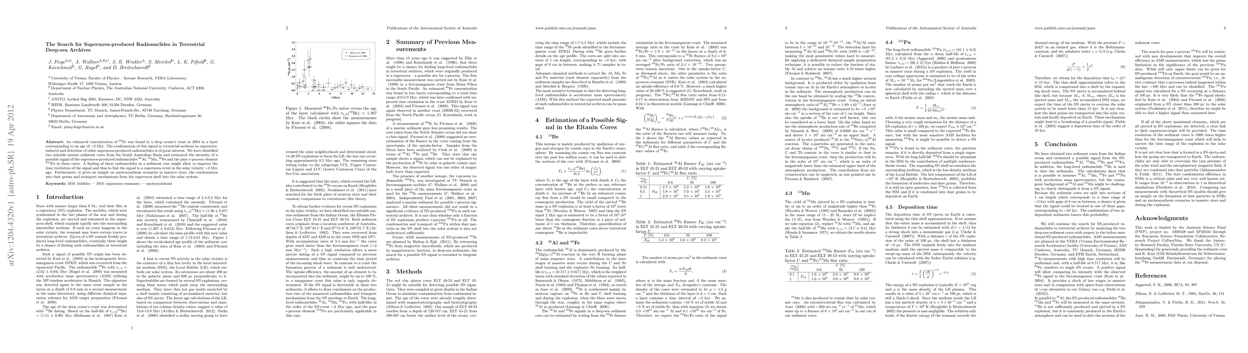 An enhanced concentration of 60Fe was found in a deep ocean's crust in 2004 in a layer corresponding to an age of ~2 Myr. The confirmation of this signal in terrestrial archives as supernova-induced and detection of other supernova-produced radionuclides is of great interest. We have identified two suitable marine sediment cores from the South Australian Basin and estimated the intensity of a possible signal of the supernova-produced radionuclides 26Al, 53Mn, 60Fe and the pure r-process element 244Pu in these cores. A finding of these radionuclides in a sediment core might allow to improve the time resolution of the signal and thus to link the signal to a supernova event in the solar vicinity ~2 Myr ago. Furthermore, it gives an insight on nucleosynthesis scenarios in massive stars, the condensation into dust grains and transport mechanisms from the supernova shell into the solar system.