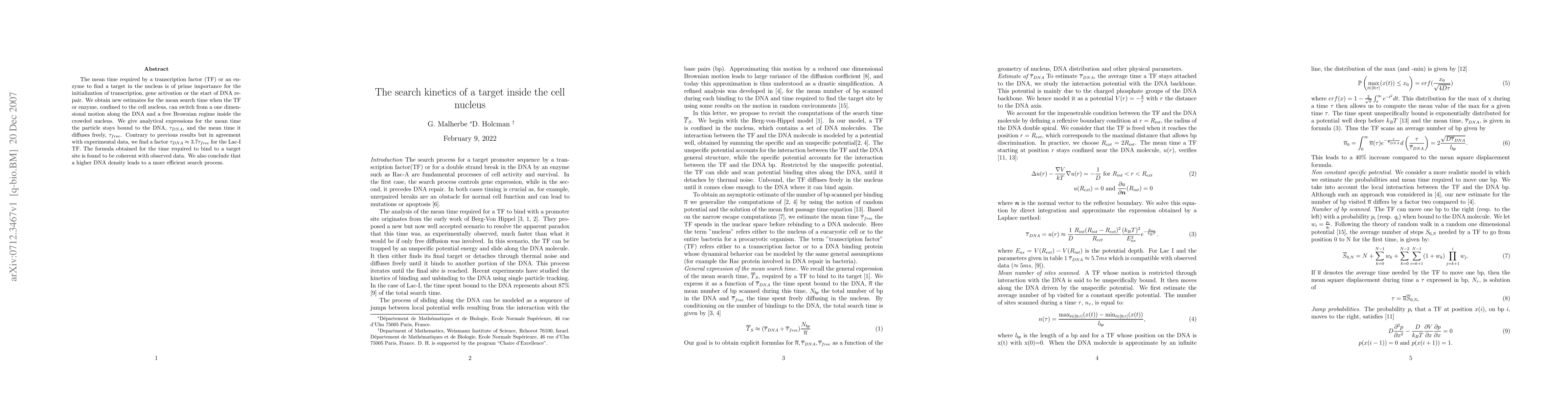 The mean time required by a transcription factor (TF) or an enzyme to find a target in the nucleus is of prime importance for the initialization of transcription, gene activation or the start of DNA repair. We obtain new estimates for the mean search time when the TF or enzyme, confined to the cell nucleus, can switch from a one dimensional motion along the DNA and a free Brownian regime inside the crowded nucleus. We give analytical expressions for the mean time the particle stays bound to the DNA, $\tau_{DNA}$, and the mean time it diffuses freely, $\tau_{free}$. Contrary to previous results but in agreement with experimental data, we find a factor $\tau_{DNA} \approx 3.7 \tau_{free}$ for the Lac-I TF. The formula obtained for the time required to bind to a target site is found to be coherent with observed data. We also conclude that a higher DNA density leads to a more efficient search process.