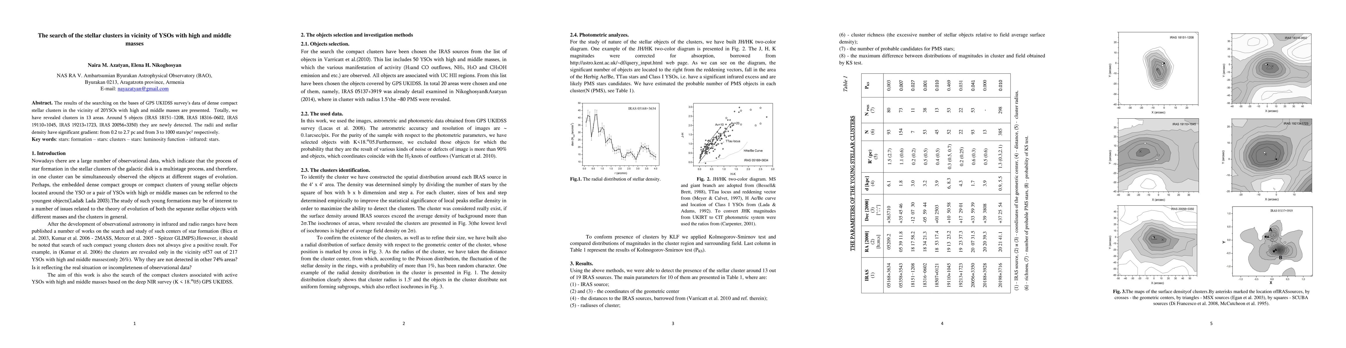 The results of the searching on the bases of GPS UKIDSS survey's data of dense compact stellar clusters in the vicinity of 20 YSOs with high and middle masses are presented. Totally we have revealed clusters in 13 areas. Around 5 objects (IRAS 18151-1208, IRAS 18316-0602, IRAS 19110+1045, IRAS 19213+1723, IRAS 20056+3350) they are newly detected. The radii and stellar density have significant gradient: from 0.2 to 2.7 pc and from 3 to 1000 stars/arcmin^2 respectively.