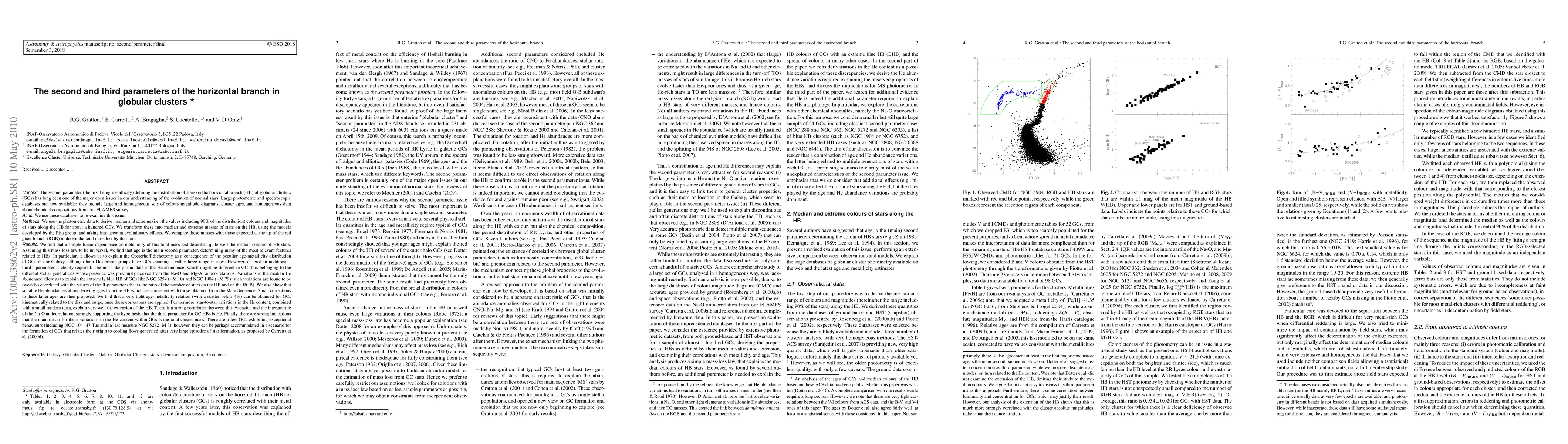 The Horizontal Branch (HB) second parameter of Globular Clusters (GCs) is a major open issue in stellar evolution. Large photometric and spectroscopic databases allow a re-examination of this issue. We derive median and extreme (90% of the distribution) colours and magnitudes of stars along the HB for about a hundred GCs. We transform these into median and extreme masses of stars on the HB taking into account evolutionary effects, and compare these masses with those expected at the tip of the Red Giant Branch to derive the total mass lost by the stars. A simple linear dependence on metallicity of this total mass lost explains well the median colours of HB stars. Adopting this mass loss law as universal, we find that age is the main second parameter. However, at least a third parameter is clearly required. The most likely candidate is the He abundance, which might be different in GCs stars belonging to the different stellar generations whose presence was previously derived from the Na-O and Mg-Al anticorrelations. Variations in the median He abundance allow explaining the extremely blue HB of some GCs; such variations are correlated with the R-parameter. Suitable He abundances allow deriving ages from the HB which are consistent with those obtained from the Main Sequence. Small corrections to these latter ages are then proposed, producing a tight age-metallicity relation for disk and bulge GCs. Star-to-star variations in the He content explain the extension of the HB. There is a strong correlation between this extension and the interquartile of the Na-O anticorrelation. The main driver for the variations in the He-content within GCs seems the total cluster mass. 47 Tuc and M3 exhibit exceptional behaviours; however, they can be accommodated in a scenario for the formation of GCs that relates their origin to cooling flows generated after very large episodes of star formation.