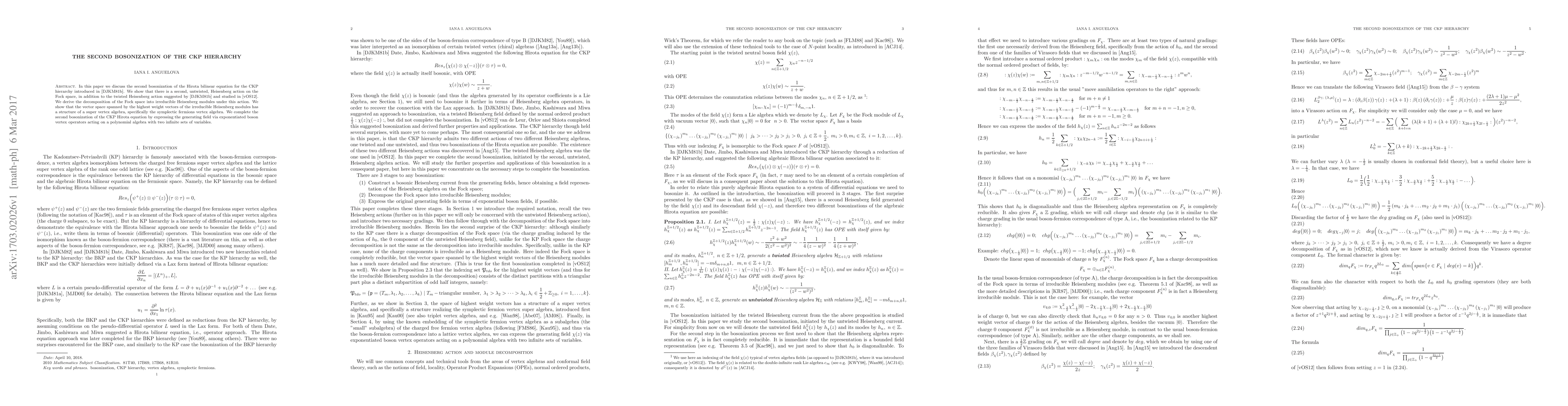 In this paper we discuss the second bosonization of the Hirota bilinear equation for the CKP hierarchy introduced by Date, Jimbo, Kashiwara and Miwa. We show that there is a second, untwisted, Heisenberg action on the Fock space, in addition to the twisted Heisenberg action suggested by Date, Jimbo, Kashiwara and Miwa and studied by van de Leur, Orlov and Shiota. We derive the decomposition of the Fock space into irreducible Heisenberg modules under this action. We show that the space spanned by the highest weight vectors of the irreducible Heisenberg modules has a structure of a super vertex algebra, specifically the symplectic fermions vertex algebra. We complete the second bosonization of the CKP Hirota equation by expressing the generating field via exponentiated boson vertex operators acting on a polynomial algebra with two infinite sets of variables.