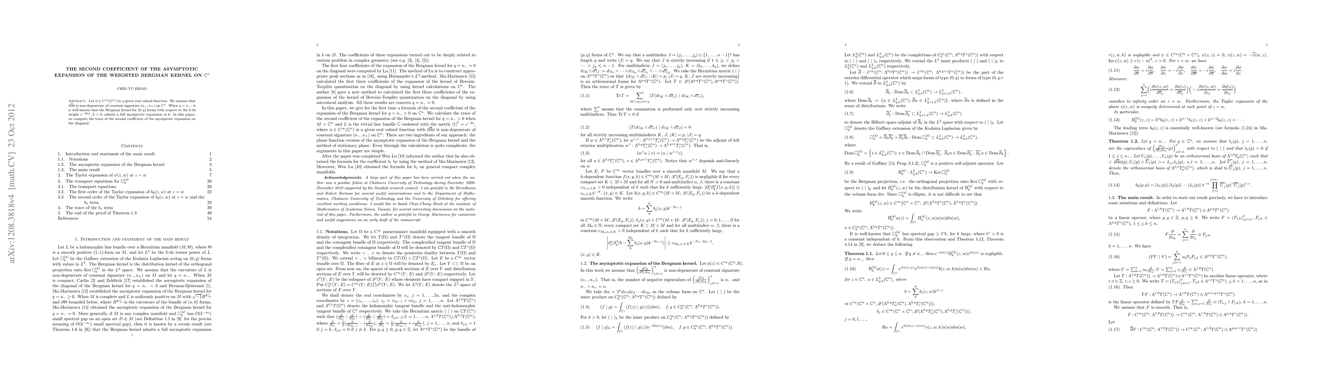 This paper computes the trace of the second coefficient in the asymptotic expansion of the weighted Bergman kernel for $(0,q)$ forms on $\Complex^n$, where $q=n_-$ and $\pr\ddbar\phi$ is non-degenerate with constant signature $(n_-,n_+)$. The expansion is derived with respect to the weight $e^{-2k\phi}$.