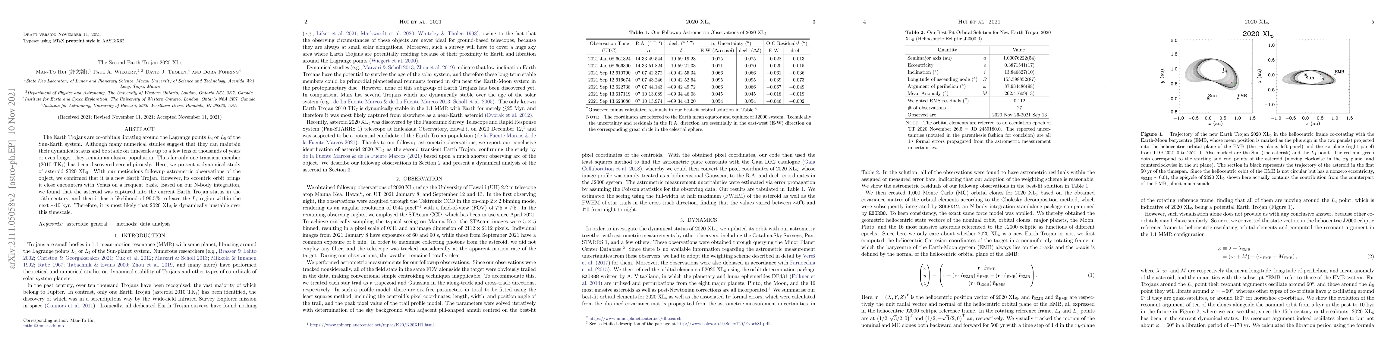 The paper confirms the discovery of the second Earth Trojan asteroid, 2020 XL$_5$, through detailed astrometric observations. Despite its stable capture in the 15th century, the asteroid's eccentric orbit predicts a high likelihood of it leaving the $L_4$ region within the next 10,000 years due to frequent encounters with Venus.