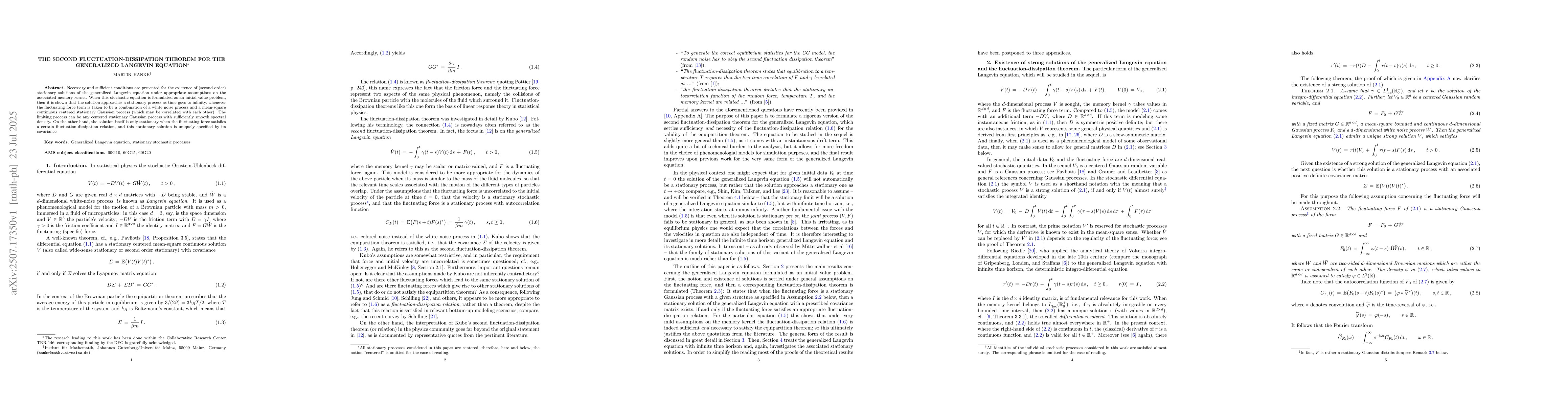 The paper presents a detailed analysis of the generalized Langevin equation, focusing on the second fluctuation-dissipation theorem. It establishes necessary and sufficient conditions for the existence of stationary solutions under specific assumptions on the memory kernel.