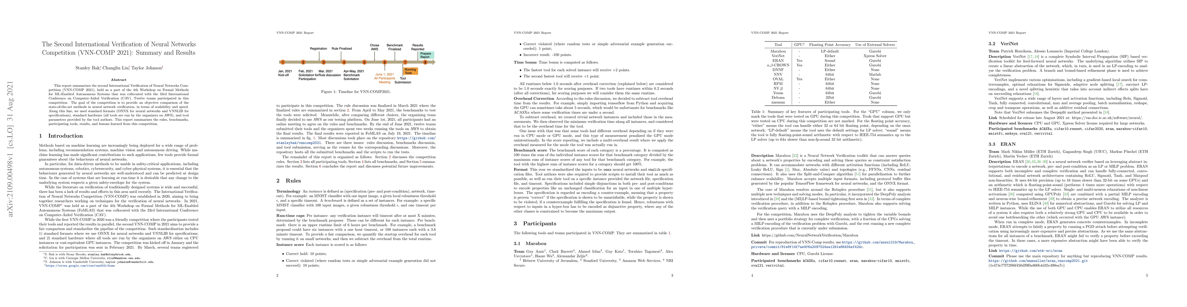 This report summarizes the second International Verification of Neural Networks Competition (VNN-COMP 2021), held as a part of the 4th Workshop on Formal Methods for ML-Enabled Autonomous Systems that was collocated with the 33rd International Conference on Computer-Aided Verification (CAV). Twelve teams participated in this competition. The goal of the competition is to provide an objective comparison of the state-of-the-art methods in neural network verification, in terms of scalability and speed. Along this line, we used standard formats (ONNX for neural networks and VNNLIB for specifications), standard hardware (all tools are run by the organizers on AWS), and tool parameters provided by the tool authors. This report summarizes the rules, benchmarks, participating tools, results, and lessons learned from this competition.