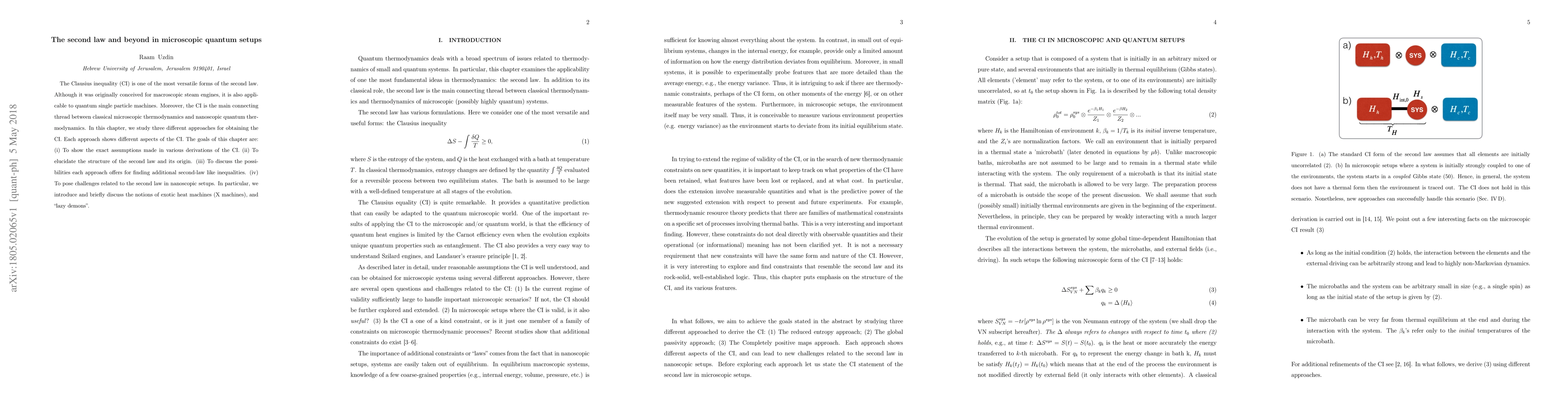 The Clausius inequality (CI) is one of the most versatile forms of the second law. Although it was originally conceived for macroscopic steam engines, it is also applicable to quantum single particle machines. Moreover, the CI is the main connecting thread between classical microscopic thermodynamics and nanoscopic quantum thermodynamics. In this chapter, we study three different approaches for obtaining the CI. Each approach shows different aspects of the CI. The goals of this chapter are: (i) To show the exact assumptions made in various derivations of the CI. (ii) To elucidate the structure of the second law and its origin. (iii) To discuss the possibilities each approach offers for finding additional second-law like inequalities. (iv) To pose challenges related to the second law in nanoscopic setups. In particular, we introduce and briefly discuss the notions of exotic heat machines (X machines), and "lazy demons".