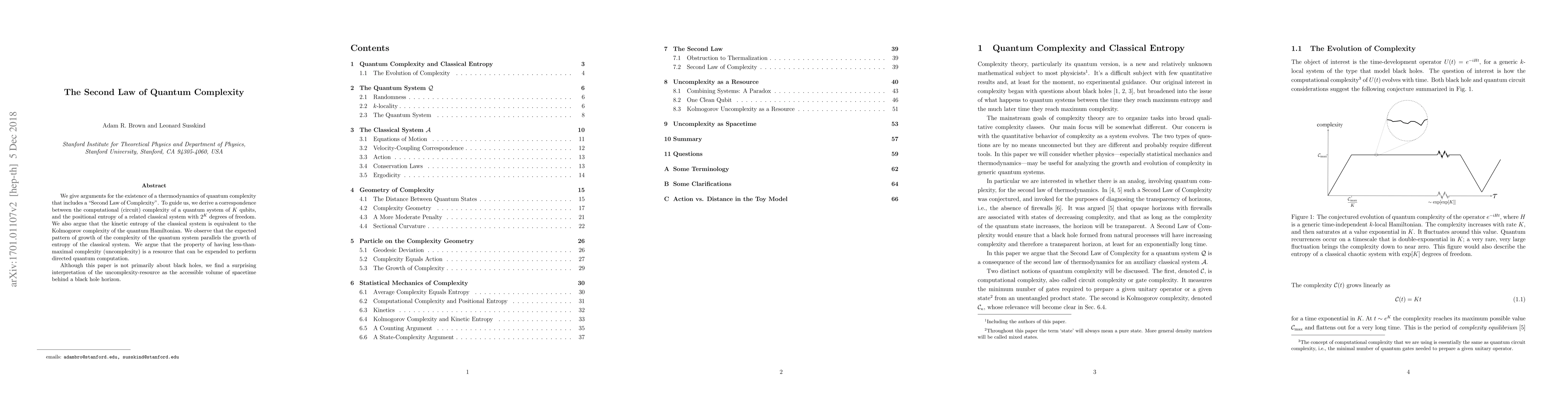We give arguments for the existence of a thermodynamics of quantum complexity that includes a "Second Law of Complexity". To guide us, we derive a correspondence between the computational (circuit) complexity of a quantum system of $K$ qubits, and the positional entropy of a related classical system with $2^K$ degrees of freedom. We also argue that the kinetic entropy of the classical system is equivalent to the Kolmogorov complexity of the quantum Hamiltonian. We observe that the expected pattern of growth of the complexity of the quantum system parallels the growth of entropy of the classical system. We argue that the property of having less-than-maximal complexity (uncomplexity) is a resource that can be expended to perform directed quantum computation. Although this paper is not primarily about black holes, we find a surprising interpretation of the uncomplexity-resource as the accessible volume of spacetime behind a black hole horizon.