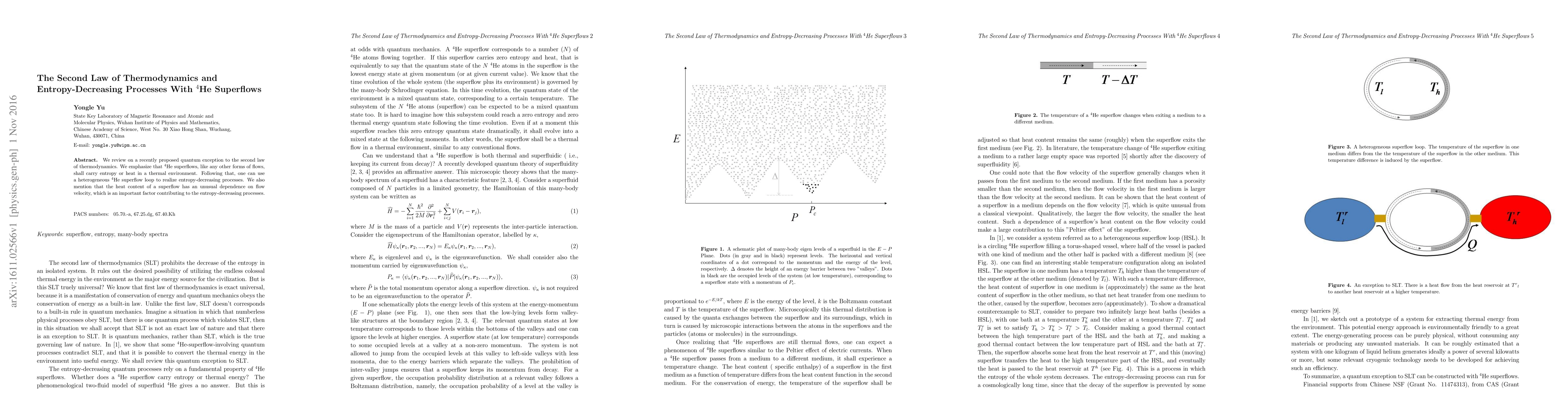 We review on a recently proposed quantum exception to the second law of thermodynamics. We emphasize that $^4$He superflows, like any other forms of flows, shall carry entropy or heat in a thermal environment. Following that, one can use a heterogeneous $^4$He superflow loop to realize entropy-decreasing processes. We also mention that the heat content of a superflow has an unusual dependence on flow velocity, which is an important factor contributing to the entropy-decreasing processes.