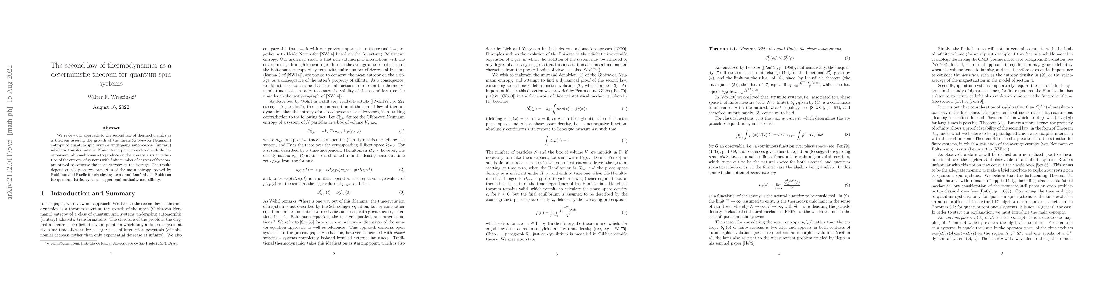 This paper reviews a deterministic approach to the second law of thermodynamics in quantum spin systems, asserting that mean entropy grows during automorphic adiabatic transformations. It proves that non-automorphic interactions with the environment conserve mean entropy on average, relying on properties like upper semicontinuity and affinity.