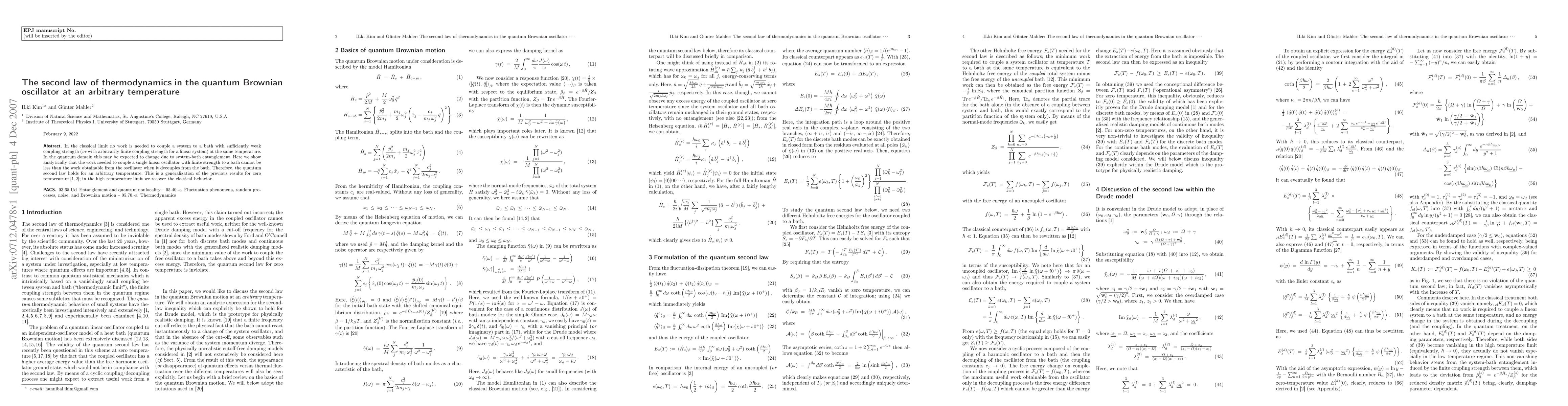 In the classical limit no work is needed to couple a system to a bath with sufficiently weak coupling strength (or with arbitrarily finite coupling strength for a linear system) at the same temperature. In the quantum domain this may be expected to change due to system-bath entanglement. Here we show analytically that the work needed to couple a single linear oscillator with finite strength to a bath cannot be less than the work obtainable from the oscillator when it decouples from the bath. Therefore, the quantum second law holds for an arbitrary temperature. This is a generalization of the previous results for zero temperature [1,2]; in the high temperature limit we recover the classical behavior.