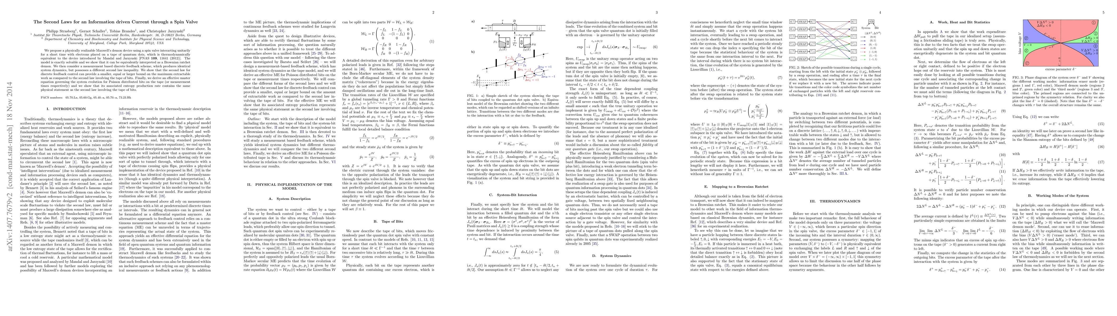 We propose a physically realizable Maxwell's demon device using a spin valve interacting unitarily for a short time with electrons placed on a tape of quantum dots, which is thermodynamically equivalent to the device introduced by Mandal and Jarzynski [PNAS 109, 11641 (2012)]. The model is exactly solvable and we show that it can be equivalently interpreted as a Brownian ratchet demon. We then consider a measurement based discrete feedback scheme, which produces identical system dynamics, but possesses a different second law inequality. We show that the second law for discrete feedback control can provide a smaller, equal or larger bound on the maximum extractable work as compared to the second law involving the tape of bits. Finally, we derive an effective master equation governing the system evolution for Poisson distributed bits on the tape (or measurement times respectively) and we show that its associated entropy production rate contains the same physical statement as the second law involving the tape of bits.