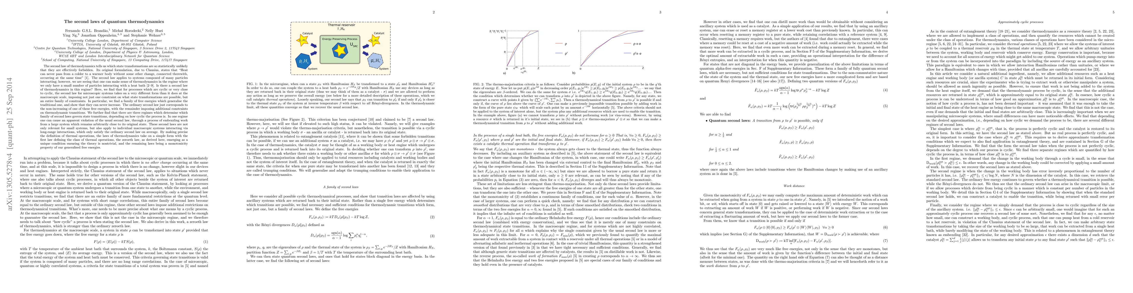 This paper explores the second laws of quantum thermodynamics for small systems and cyclic processes, revealing that they impose a family of constraints rather than a single one. It introduces generalized free energies that never increase and identifies three regimes governing state transitions, highlighting the relevance of these laws for both small systems and macroscopic systems with long-range interactions.