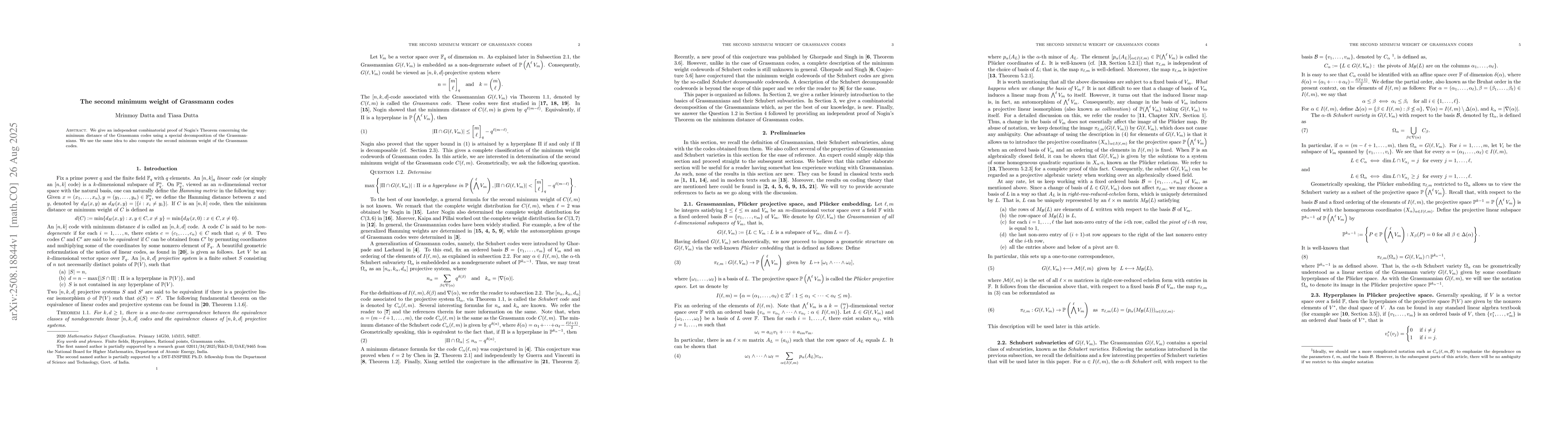 We give an independent combinatorial proof of Nogin's Theorem concerning the minimum distance of the Grassmann codes using a special decomposition of the Grassmannians. We use the same idea to also compute the second minimum weight of the Grassmann codes.