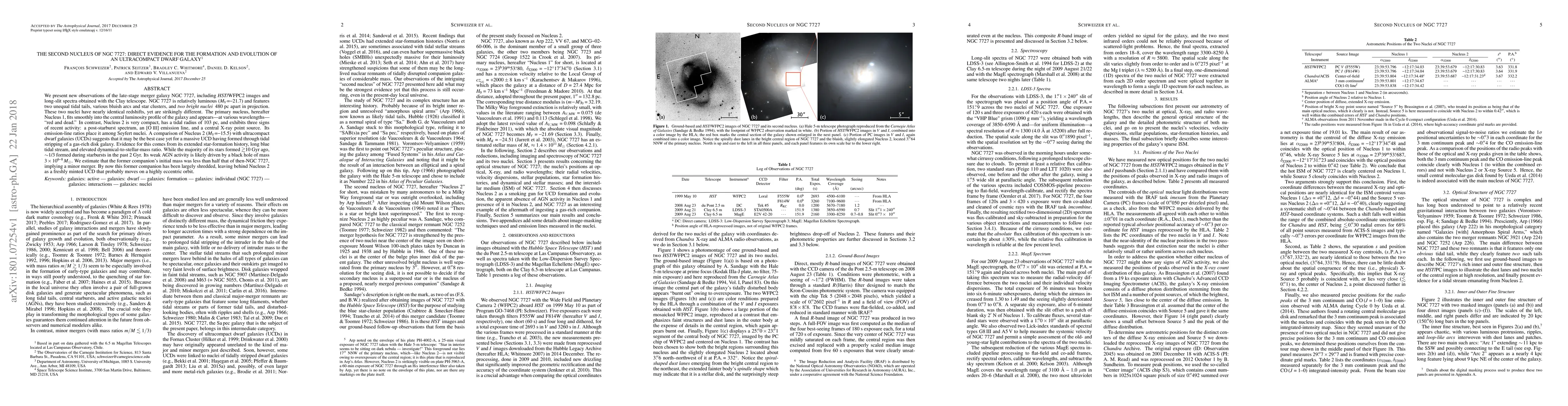 We present new observations of the late-stage merger galaxy NGC 7727, including HST/WFPC2 images and long-slit spectra obtained with the Clay telescope. NGC 7727 is relatively luminous ($M_V = -21.7$) and features two unequal tidal tails, various bluish arcs and star clusters, and two bright nuclei 480 pc apart in projection. These two nuclei have nearly identical redshifts, yet are strikingly different. The primary nucleus, hereafter Nucleus_1, fits smoothly into the central luminosity profile of the galaxy and appears--at various wavelengths--"red and dead." In contrast, Nucleus_2 is very compact, has a tidal radius of 103 pc, and exhibits three signs of recent activity: a post-starburst spectrum, an [O III]_5007 emission line, and a central X-ray point source. Its emission-line ratios place it among Seyfert nuclei. A comparison of Nucleus_2 ($M_V = -15.5$) with ultracompact dwarf galaxies (UCDs) suggests that it may be the best case yet for a massive UCD having formed through tidal stripping of a gas-rich disk galaxy. Evidence for this comes from its extended star-formation history, long blue tidal stream, and elevated dynamical-to-stellar-mass ratio. While the majority of its stars formed $\gtrsim 10$ Gyr ago, about 1/3 by mass formed during starbursts in the past 2 Gyr. Its weak AGN activity is likely driven by a black hole of mass $3\times 10^6 - 3\times 10^8 M_\odot$. We estimate that the former companion's initial mass was less than half that of then-NGC 7727, implying a minor, but significant, merger. By now this former companion has been largely shredded, leaving behind Nucleus_2 as a freshly minted UCD that probably moves on a highly eccentric orbit.