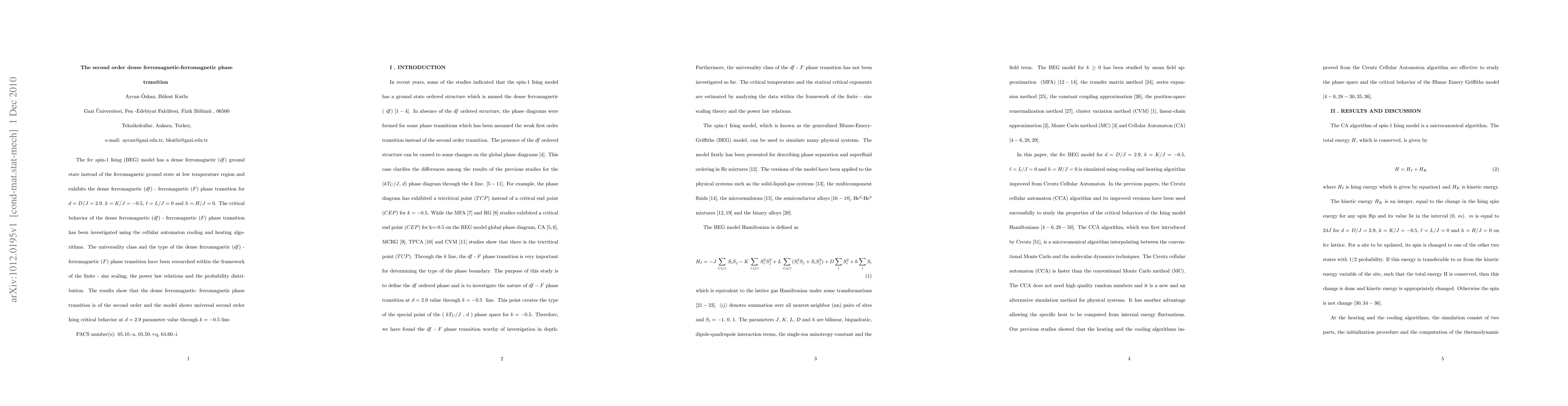 The fcc spin-1 Ising (BEG) model has a dense ferromagnetic ($df$) ground state instead of the ferromagnetic ground state at low temperature region and exhibits the dense ferromagnetic ($df$) - ferromagnetic ($F$) phase transition for $d=D/J=2.9$, $k=K/J=-0.5$, $\ell =L/J=0$ and $h=H/J=0$. The critical behavior of the dense ferromagnetic ($df$) - ferromagnetic ($F$) phase transition has been investigated using the cellular automaton cooling and heating algorithms. The universality class and the type of the dense ferromagnetic ($df$) - ferromagnetic ($F$) phase transition have been researched within the framework of the finite - size scaling, the power law relations and the probability distribution. The results show that the dense ferromagnetic- ferromagnetic phase transition is of the second order and the model shows universal second order Ising critical behavior at $d=2.9$ parameter value through $k=-0.5$ line.