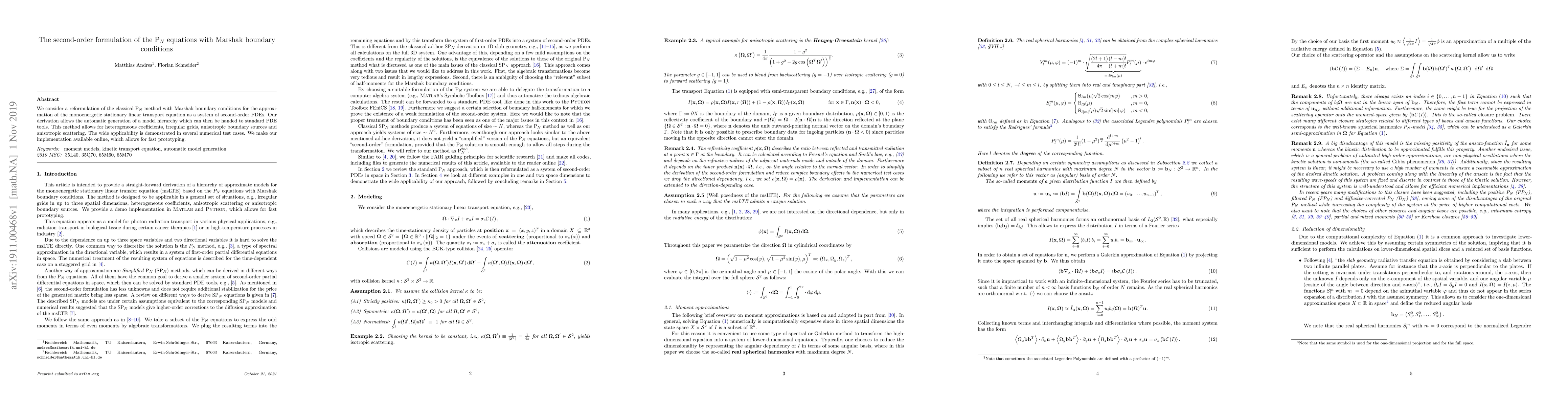 We consider a reformulation of the classical $P_N$ method with Marshak boundary conditions for the approximation of the monoenergetic stationary linear transport equation as a system of second-order PDEs. Our derivation allows the automatic generation of a model hierarchy which can then be handed to standard PDE tools. This method allows for heterogeneous coefficients, irregular grids, anisotropic boundary sources and anisotropic scattering. The wide applicability is demonstrated in several numerical test cases. We make our implementation available online, which allows for fast prototyping.