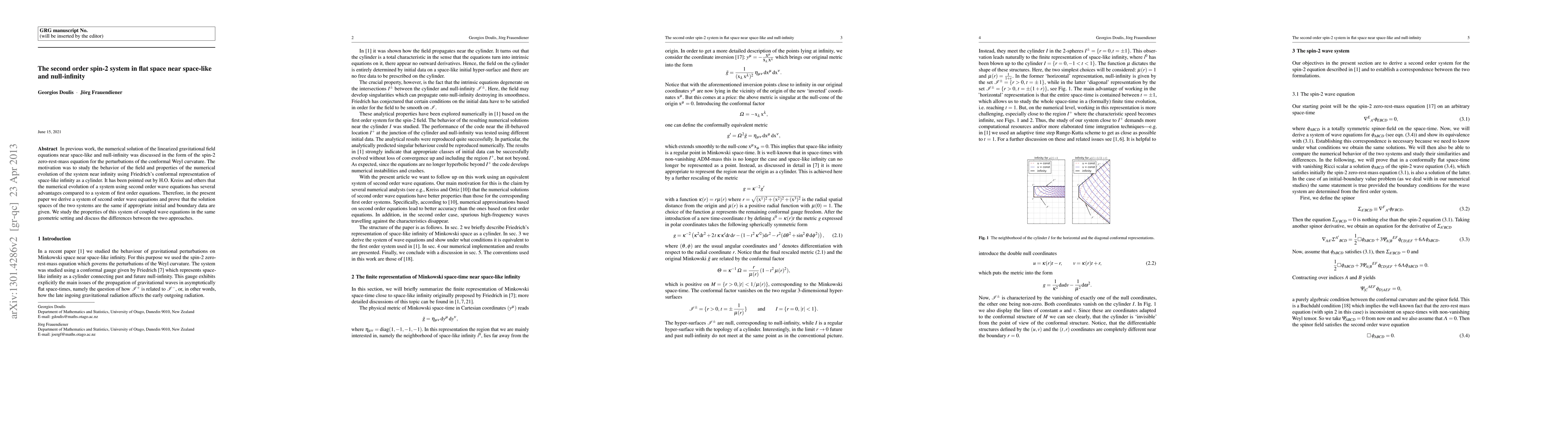 In previous work, the numerical solution of the linearized gravitational field equations near space-like and null-infinity was discussed in the form of the spin-2 zero-rest-mass equation for the perturbations of the conformal Weyl curvature. The motivation was to study the behavior of the field and properties of the numerical evolution of the system near infinity using Friedrich's conformal representation of space-like infinity as a cylinder. It has been pointed out by H.O. Kreiss and others that the numerical evolution of a system using second order wave equations has several advantages compared to a system of first order equations. Therefore, in the present paper we derive a system of second order wave equations and prove that the solution spaces of the two systems are the same if appropriate initial and boundary data are given. We study the properties of this system of coupled wave equations in the same geometric setting and discuss the differences between the two approaches.