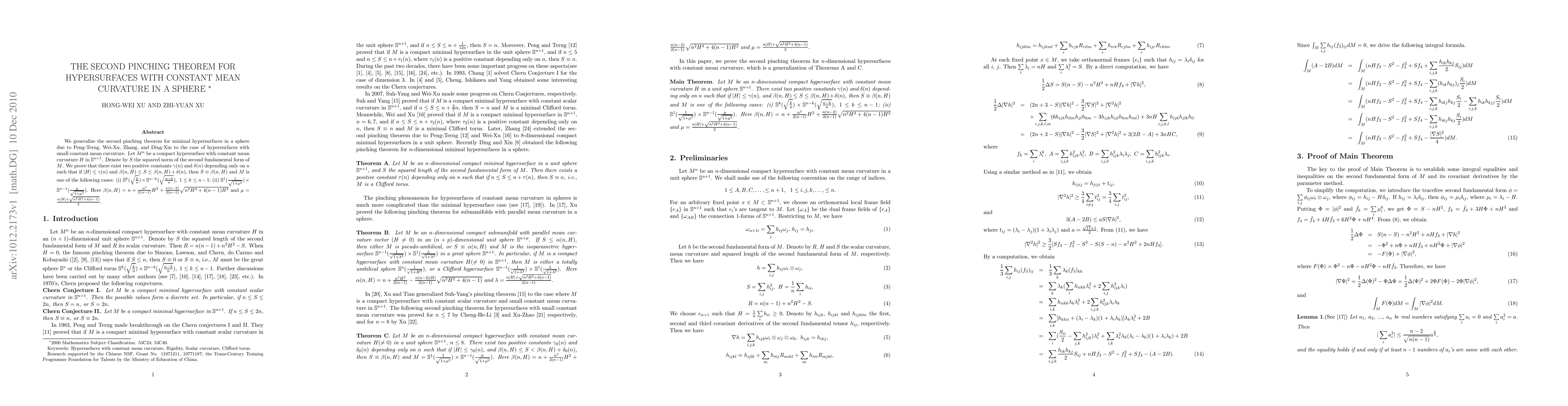 This paper generalizes the second pinching theorem for minimal hypersurfaces in a sphere to those with small constant mean curvature. It proves the existence of constants that imply the second fundamental form's squared norm is constant under specific conditions, classifying the hypersurfaces as either spherical products or cylinders.