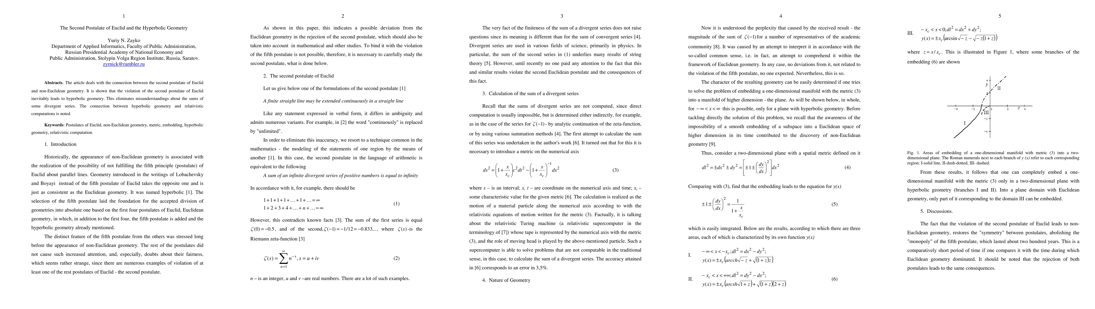 The article deals with the connection between the second postulate of Euclid and non-Euclidean geometry. It is shown that the violation of the second postulate of Euclid inevitably leads to hyperbolic geometry. This eliminates misunderstandings about the sums of some divergent series. The connection between hyperbolic geometry and relativistic computations is noted.