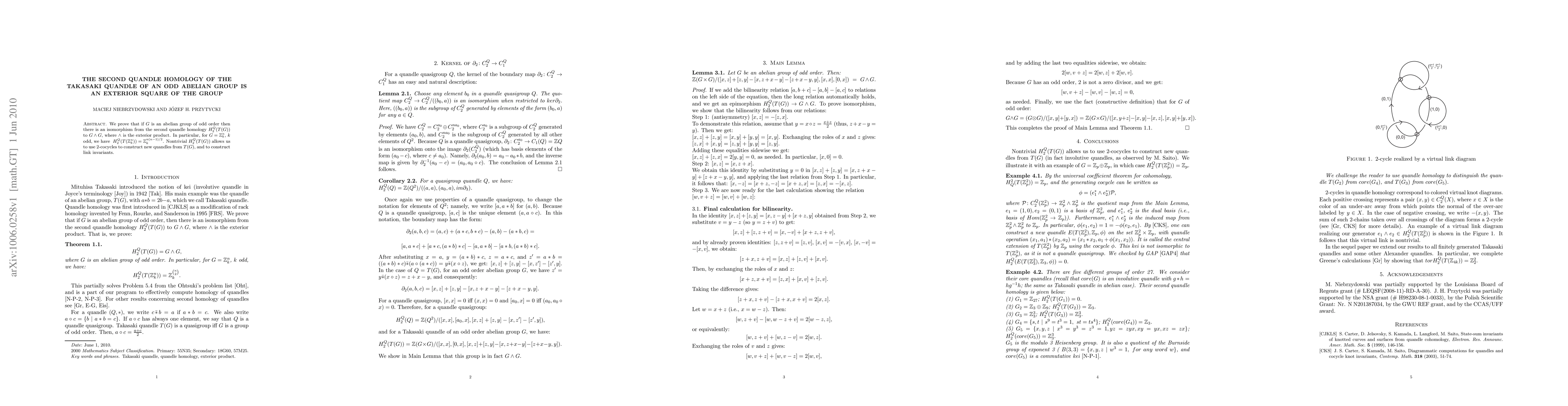 Summary: This paper proves an isomorphism between the second quandle homology of Takasaki quandles for odd-order abelian groups and the group's exterior square. It also discusses the application of this result in constructing new quandles and link invariants.