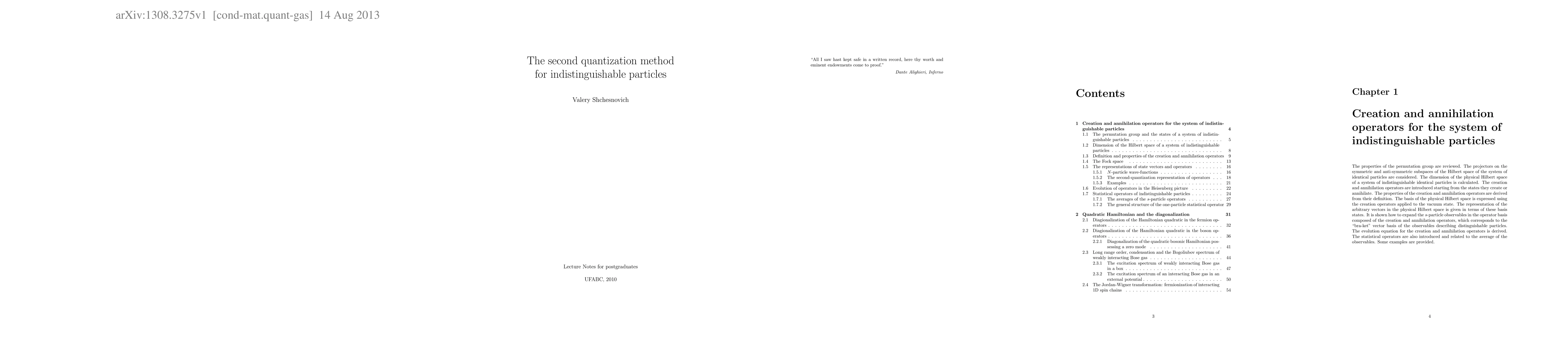 This paper explores the second quantization method for indistinguishable particles, detailing creation and annihilation operators, Fock space, and the representation of state vectors and operators. It also covers the diagonalization of quadratic Hamiltonians for fermions and bosons, long-range order in Bose gases, and the fermionization of 1D spin chains via the Jordan-Wigner transformation.
