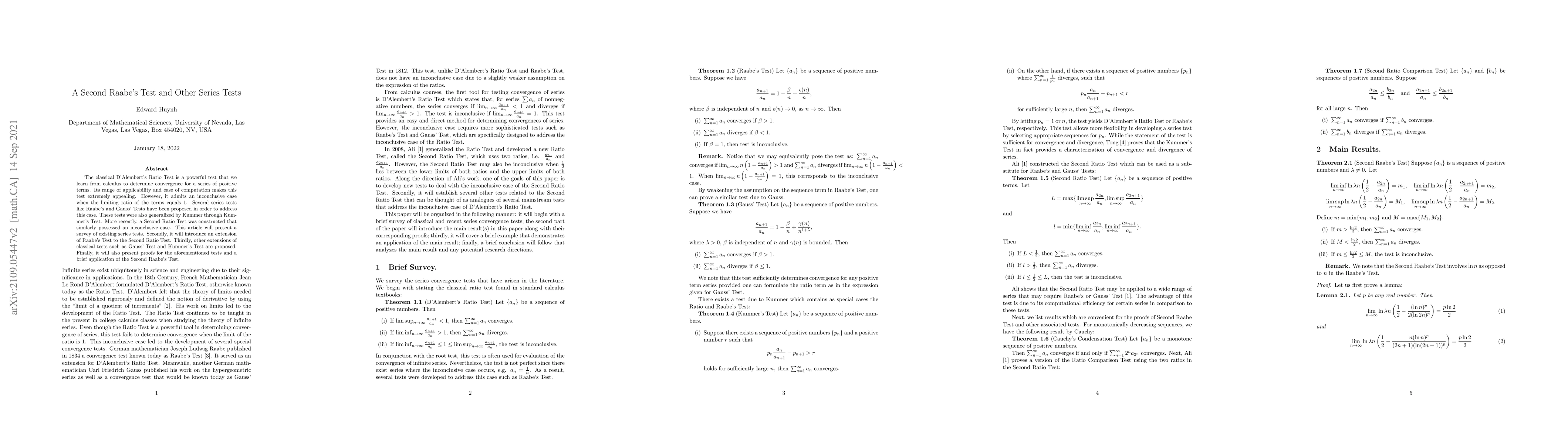 This paper surveys various series tests for convergence, including classical methods like Raabe's and Gauss' Tests, and introduces extensions such as the Second Raabe's Test, along with proofs and applications.