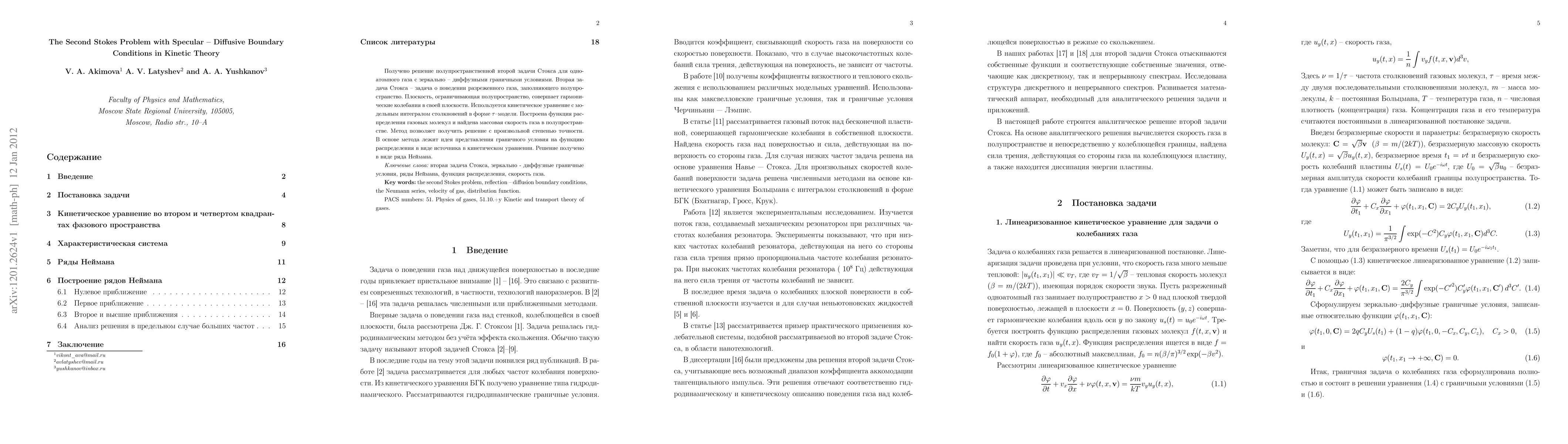 This paper addresses the second Stokes problem in kinetic theory with specular-diffusive boundary conditions, employing a novel method to solve boundary problems. The method represents boundary conditions as a source in the kinetic equation, transforming it into a Fredholm integral equation, and provides a solution in the form of Neumann's series with adjustable accuracy.