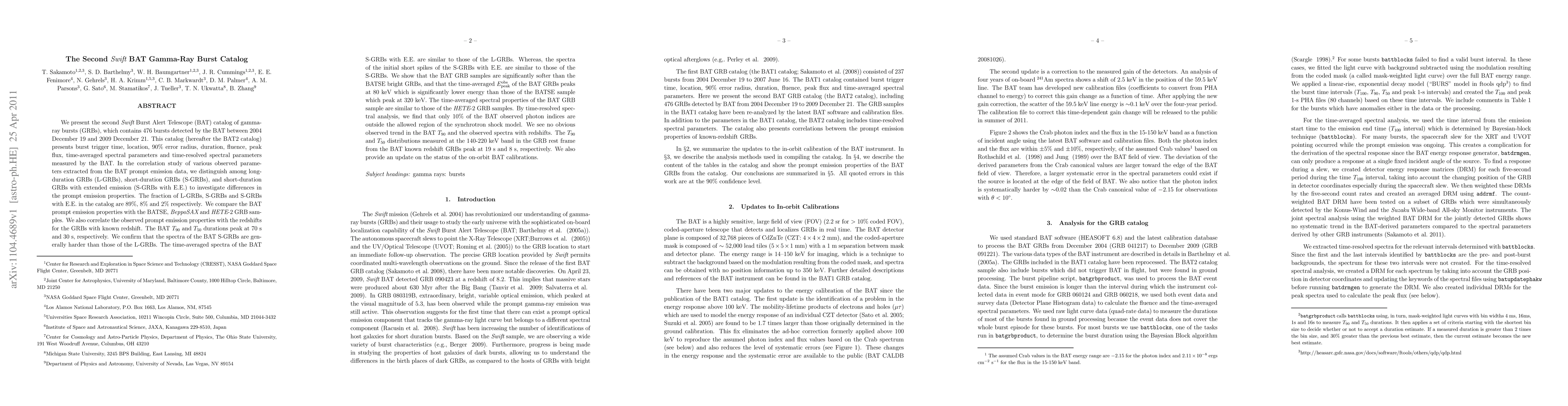 The second Swift BAT gamma-ray burst catalog (BAT2) includes 476 GRBs detected between 2004 and 2009, distinguishing among long, short, and short with extended emission bursts. The study finds that the BAT GRB sample is softer and has a lower peak energy compared to previous samples, with most spectral properties aligning with synchrotron models.