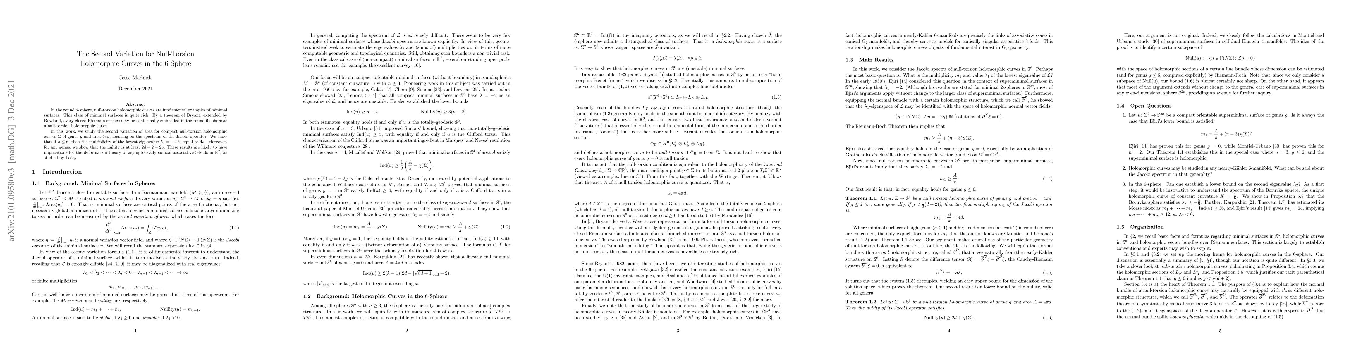 This paper investigates the second variation of area for compact null-torsion holomorphic curves in the round 6-sphere, focusing on the spectrum of the Jacobi operator. It finds that the multiplicity of the lowest eigenvalue is $4d$ for genus $g \leq 6$ and establishes a lower bound for nullity as $2d + 2 - 2g$.