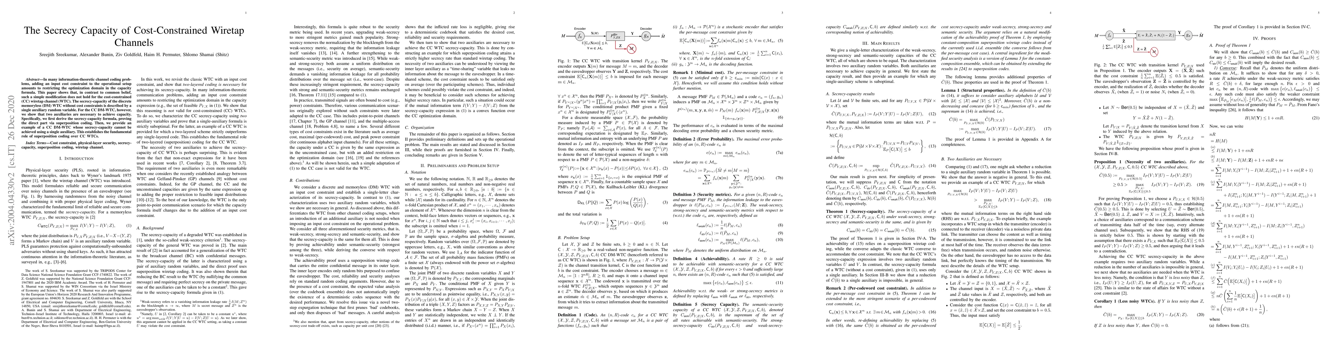 This paper demonstrates that cost constraints in wiretap channels fundamentally alter the secrecy-capacity formula, requiring two auxiliary random variables instead of one, and highlights the necessity of superposition coding for achieving capacity.