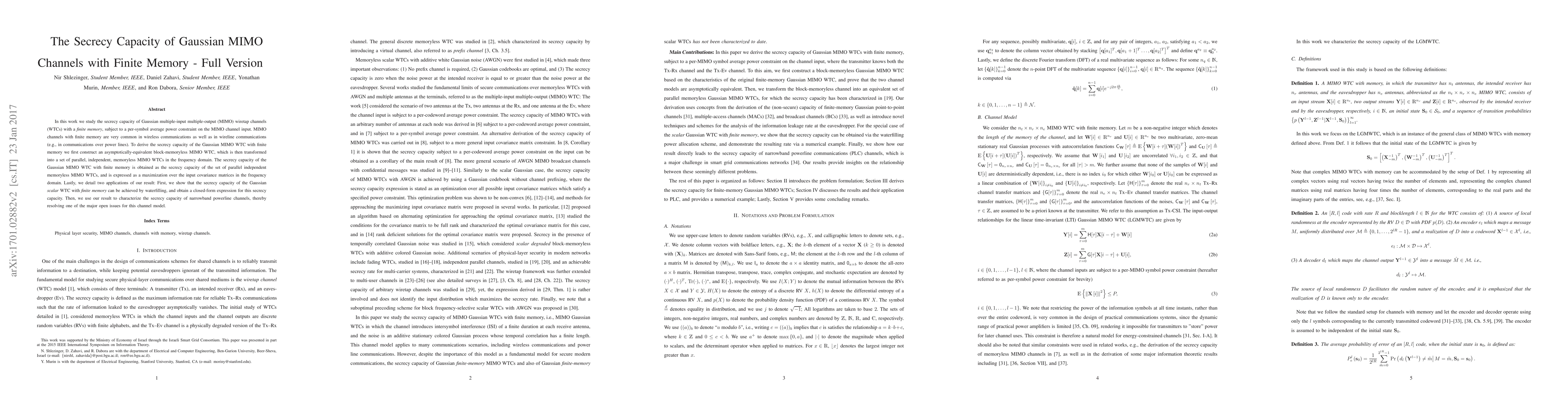 In this work we study the secrecy capacity of Gaussian multiple-input multiple-output (MIMO) wiretap channels (WTCs) with a finite memory, subject to a per-symbol average power constraint on the MIMO channel input. MIMO channels with finite memory are very common in wireless communications as well as in wireline communications (e.g., in communications over power lines). To derive the secrecy capacity of the Gaussian MIMO WTC with finite memory we first construct an asymptotically-equivalent block-memoryless MIMO WTC, which is then transformed into a set of parallel, independent, memoryless MIMO WTCs in the frequency domain. The secrecy capacity of the Gaussian MIMO WTC with finite memory is obtained as the secrecy capacity of the set of parallel independent memoryless MIMO WTCs, and is expressed as a maximization over the input covariance matrices in the frequency domain. Lastly, we detail two applications of our result: First, we show that the secrecy capacity of the Gaussian scalar WTC with finite memory can be achieved by waterfilling, and obtain a closed-form expression for this secrecy capacity. Then, we use our result to characterize the secrecy capacity of narrowband powerline channels, thereby resolving one of the major open issues for this channel model.