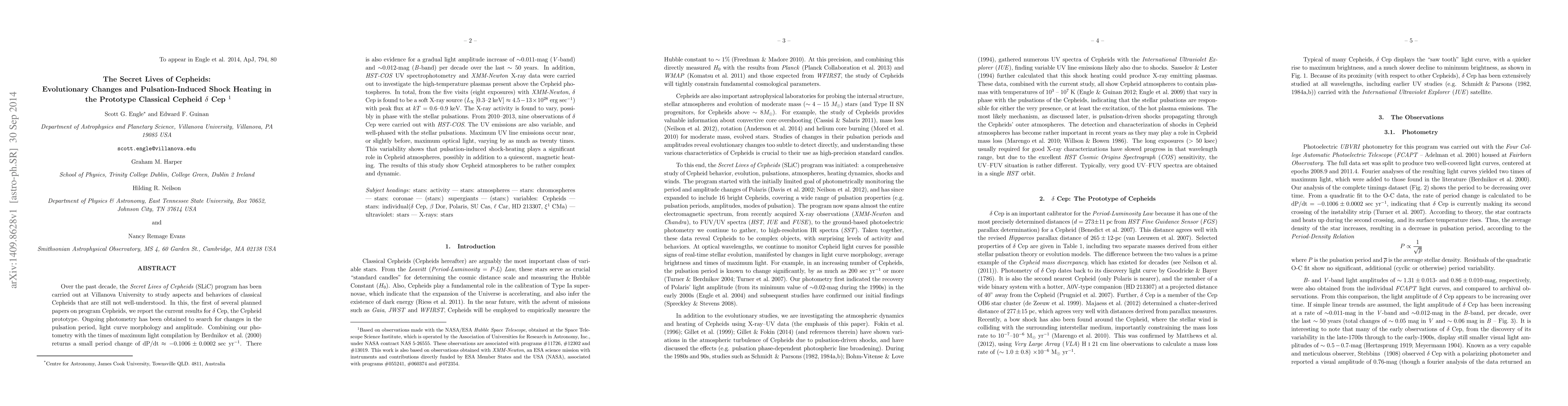 This paper investigates evolutionary changes in the Cepheid prototype δ Cep, revealing a small period decrease and gradual light amplitude increase over the last 50 years. Observations show pulsation-induced shock heating significantly affects the Cepheid's high-temperature plasmas, evidenced by variable UV and X-ray emissions synchronized with its pulsations.